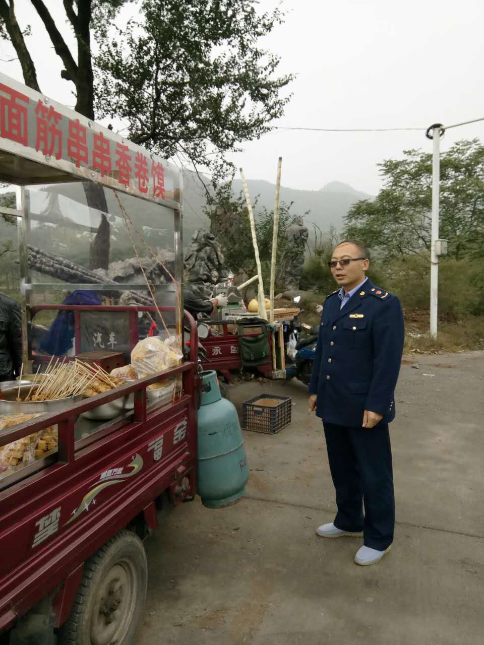 秋高气爽,天气晴朗,武术盛会即将开幕,海内外宾朋云集少林。来自周边乡镇的流动商贩也悄悄赶到。为了净化环境,维护经营秩序,景区分局工作人员全员上岗,分片包干,坚守路段,在实施交通管制前,把小商贩及时清离,确保武术表演画面纯净。