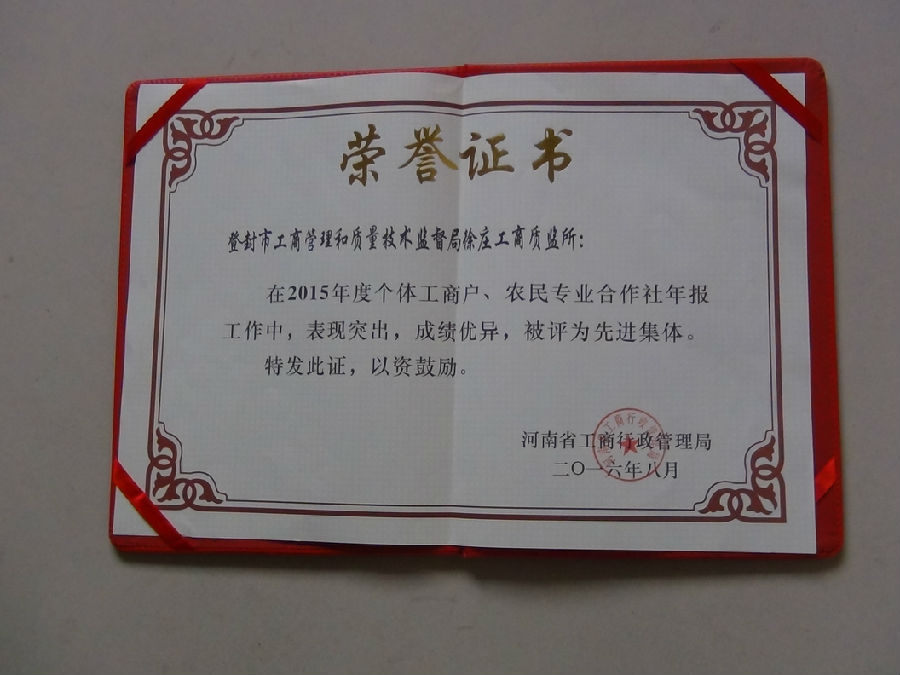 2015年度市场主体年报工作开展以来,徐庄工商质监所严格落实目标责任,创新方法、精心组织、认真履职、主动作为、攻坚克难、加班加点,积极引导广大市场主体履行年报义务,圆满完成了预定的年报目标任务。被河南省工商行政管理局评为2015年度个体工商户农民专业合作社年报先进集体。