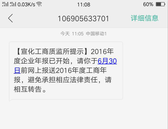 2016年度企业年报工作已经开始,按照市局要求,宣化工商质监所早行动、早部署,做好年报宣传工作,对辖区内各类企业和个体工商户发送年报提示短信,上门对商户进行网上申报指导,力争在规定的时间完成2016年度企业年报工作。