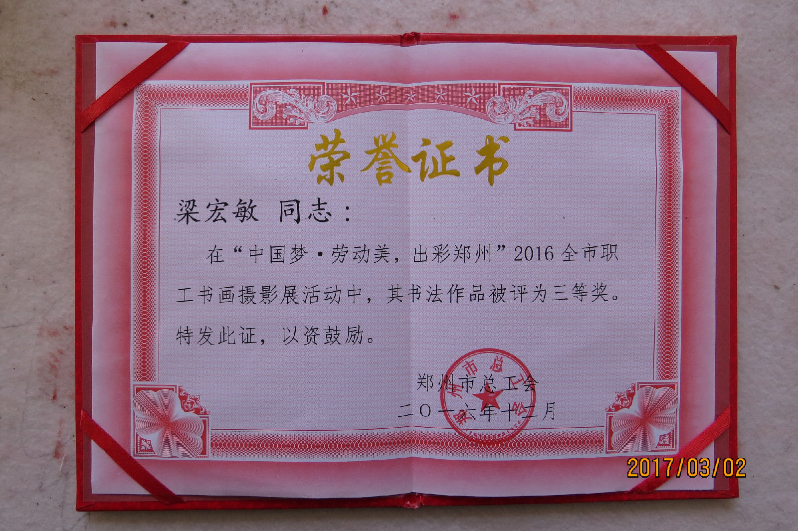 为真实、生动、艺术地展示工人阶级主力军风采和各条战线劳动者在积极投身工作之中的劳动之美、创造之美、奉献之美,我局职工梁红敏代表工商质监系统积极参加了郑州市总工会举办的“中国梦.劳动美,出彩郑州”2016全市职工书画摄影作品展。在此次活动中,梁红敏的书法作品被郑州市总工会评为“中国梦.劳动美,出彩郑州”书画摄影展三等奖。