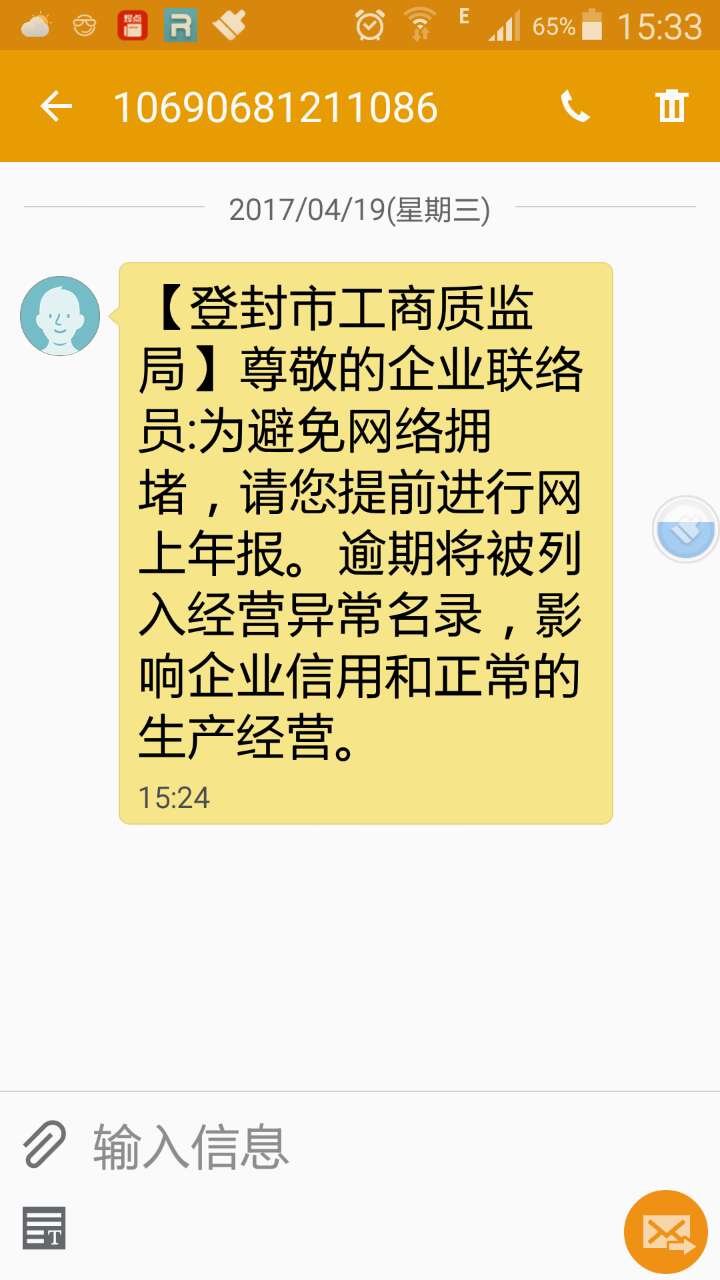 年报是企业履行法定的义务,也是工商质监部门的职责。由于部分企业法人对企业年报的意义认识不够,年报公示行动缓慢,又联系不上,为避免企业逾期错过年报公示时间,2017年4月19日,登封市工商质监局企业信用信息监督管理科,利用第三方短信方式通过中国移动、中国电信、中国联通手机平台,向目前仍未参加企业年报的企业联络员发送2016年度年报公示温馨提示2260条。使企业联络员方便、快捷收到年报提示后,尽快进行年报公示。避免临近截止日期因系统访问量激增造成拥堵,导致错过年报时间,影响信用和正常的生产经营。