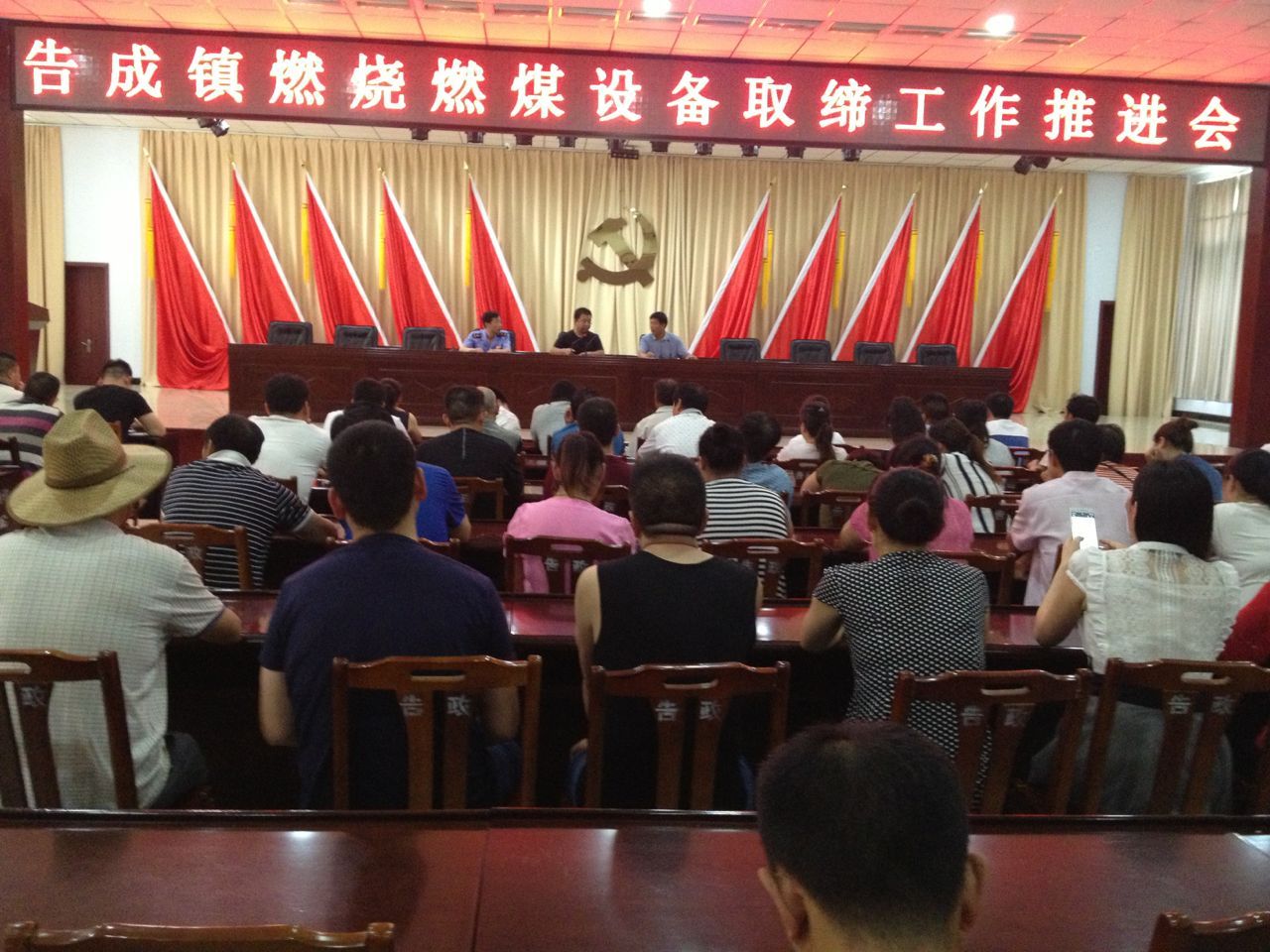 告成镇6月2日下午在镇政府会议室召开了告成镇燃烧燃煤设备取缔工作推进会,镇区内经营性燃煤企业、商户负责人参加了会议。会上告成镇副镇长吴跃伟、镇散煤办主任李银峰、告成工商质监所所长马绍辉对镇区内商用茶浴煤炉、燃煤大灶、小煤灶等燃煤设备拆除工作分别做了安排布置。3天后镇政府组织相关职能部门对燃煤设备拆除工作进行验收。