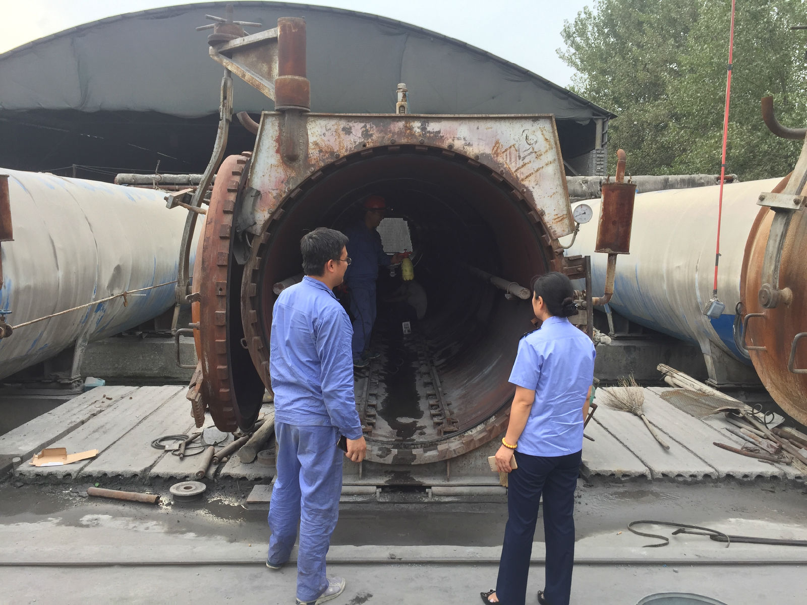 2017年9月19日,特种设备安全监察科协助河南省锅炉压力容器安全检测研究院,对登封市浩运建材厂在用的蒸压釜进行定期检验。检验人员在现场对设备进行了详细全面的内部和外部检验。对检验中发现的问题及时记录,在检验结束后将问题进行集中整理并告知使用单位。