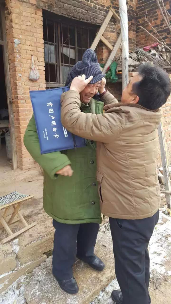 扶贫人员为贫困户穿上捐赠的大衣,带上帽子