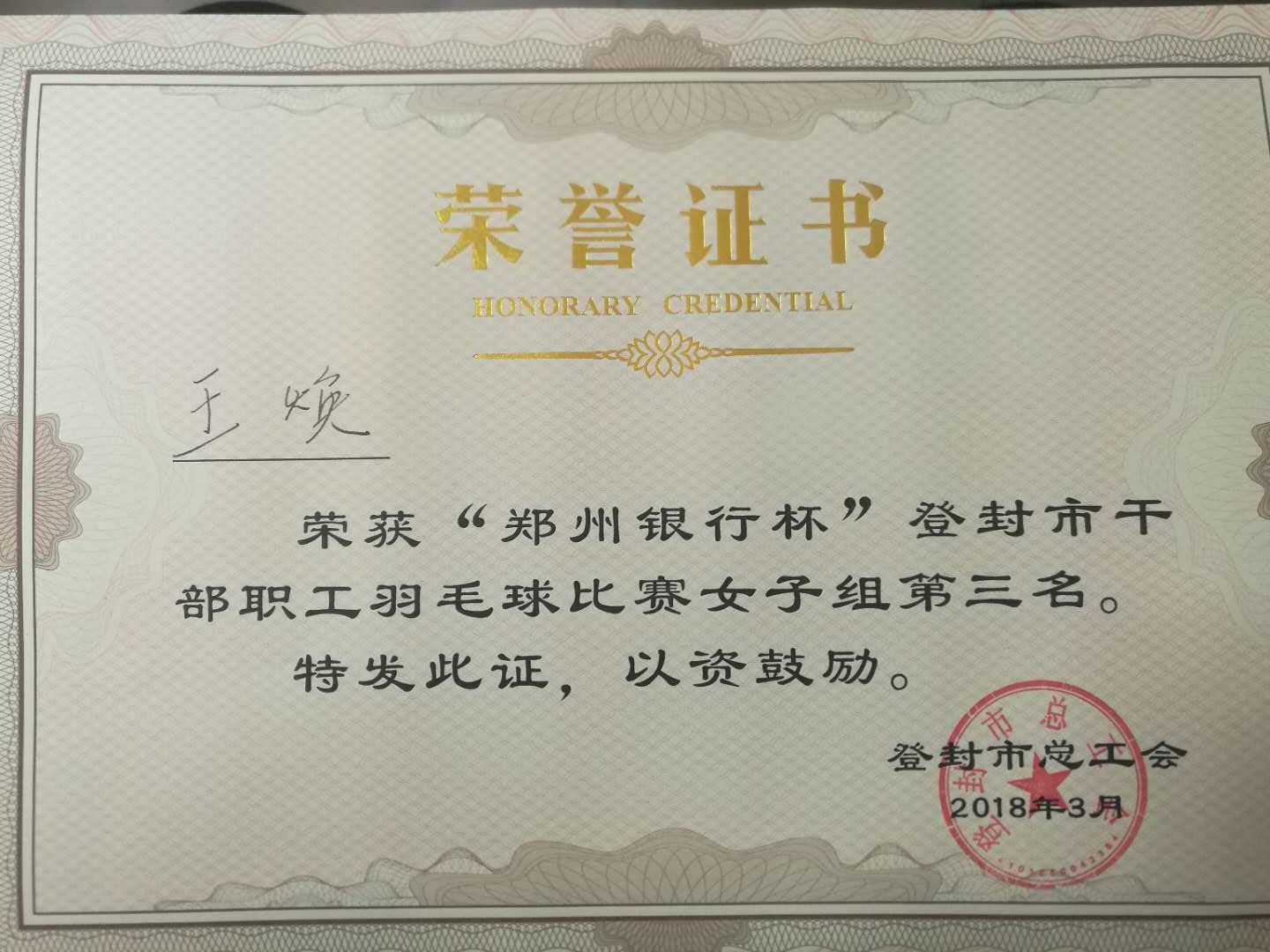 登封市工商质监局王焕同志获羽毛球比赛第三名