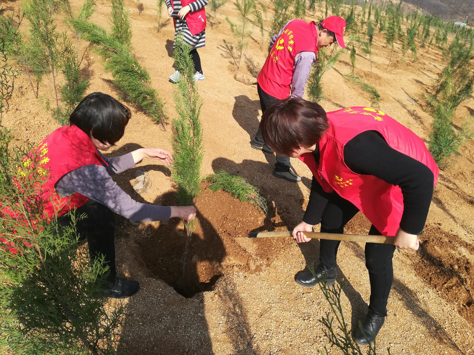 活动现场,大家相互配合,分工协作,有的挥锹铲土、有的扶树苗、浇水、踩实,每个环节都仔细认真,大家干得热火朝天。