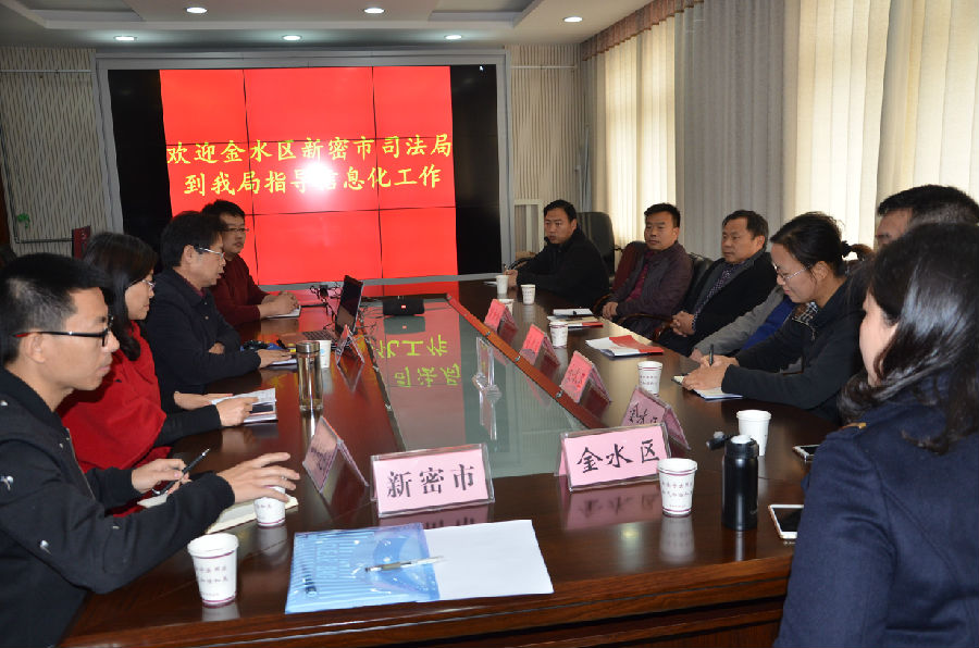 11月15日上午,金水区郭冰局长、新密市吕海盈副局长一行15人,到我局学习交流信息化建设工作。王老康局长、董洋副主任、申跃强科长、卓姆公司万总陪同座谈,座谈会上,首先王局长就我局的信息化建设的背景及应用作简要介绍,并演示了我局七大工作系统、四大管理系统、三大分析系统。随后董洋主任演示了社区矫正管理及分析系统,申跃强科长演示了人民调解、安置帮教工作及管理分析系统。