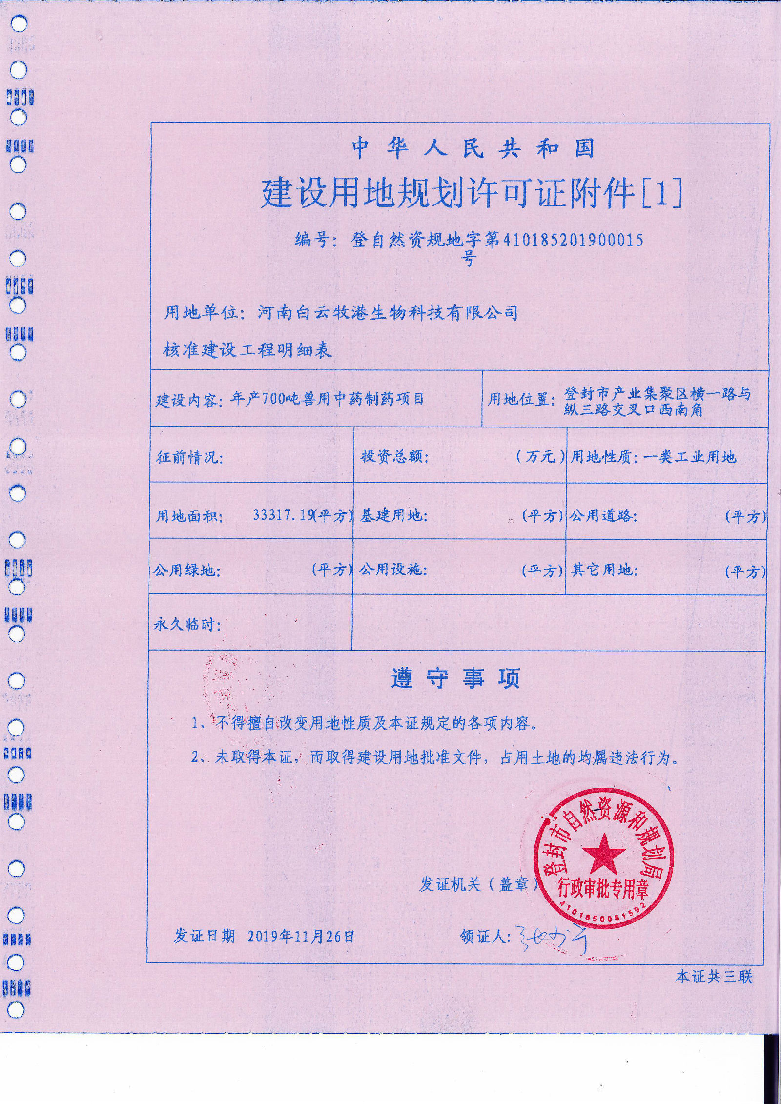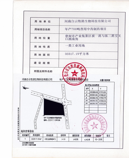 河南白云牧港生物科技有限公司年产700吨兽用中药制药项目建设用地规划许可证批后公告