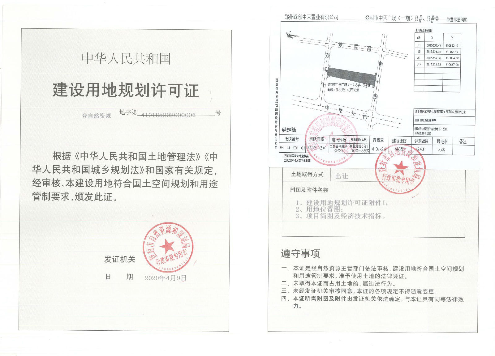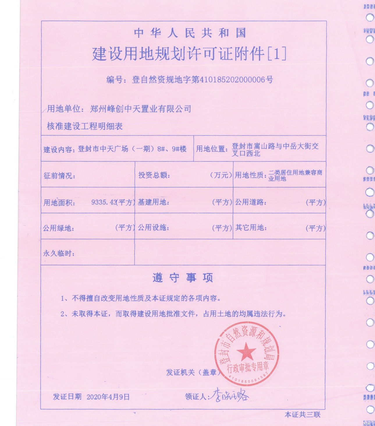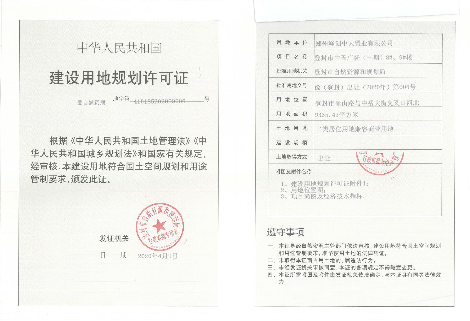 登封市自然资源和规划局关于登封市中天广场(一期)8#、9#楼建设用地规划许可证批后公告