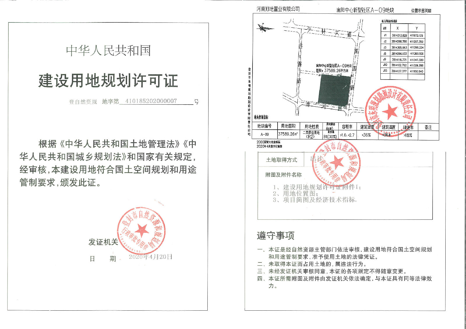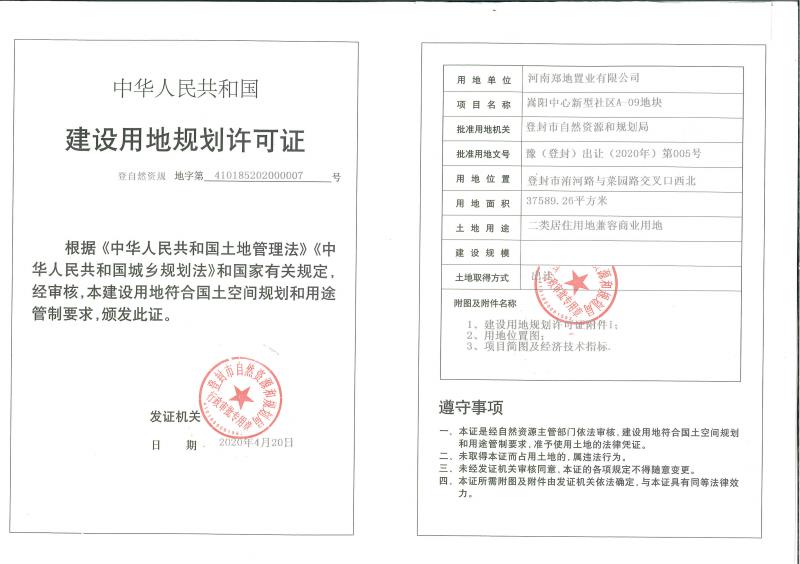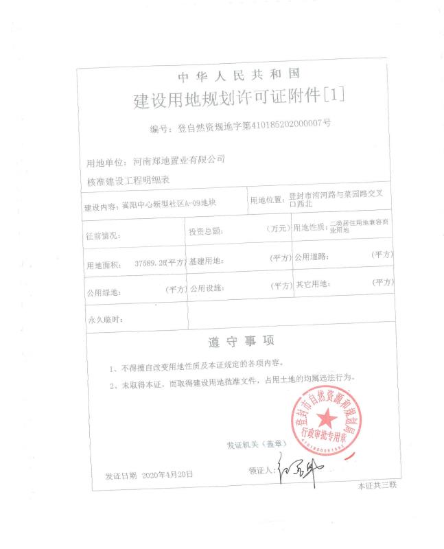 登封市自然资源和规划局关于嵩阳中心新型社区A-09地块建设用地规划许可证批后公告