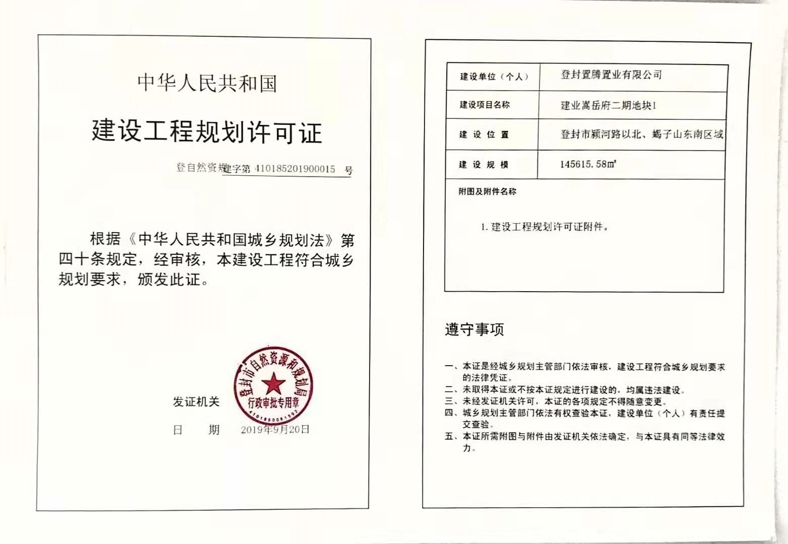 登封市自然资源和规划局关于建业嵩岳府二期地块1项目建设工程规划许可证批后公告