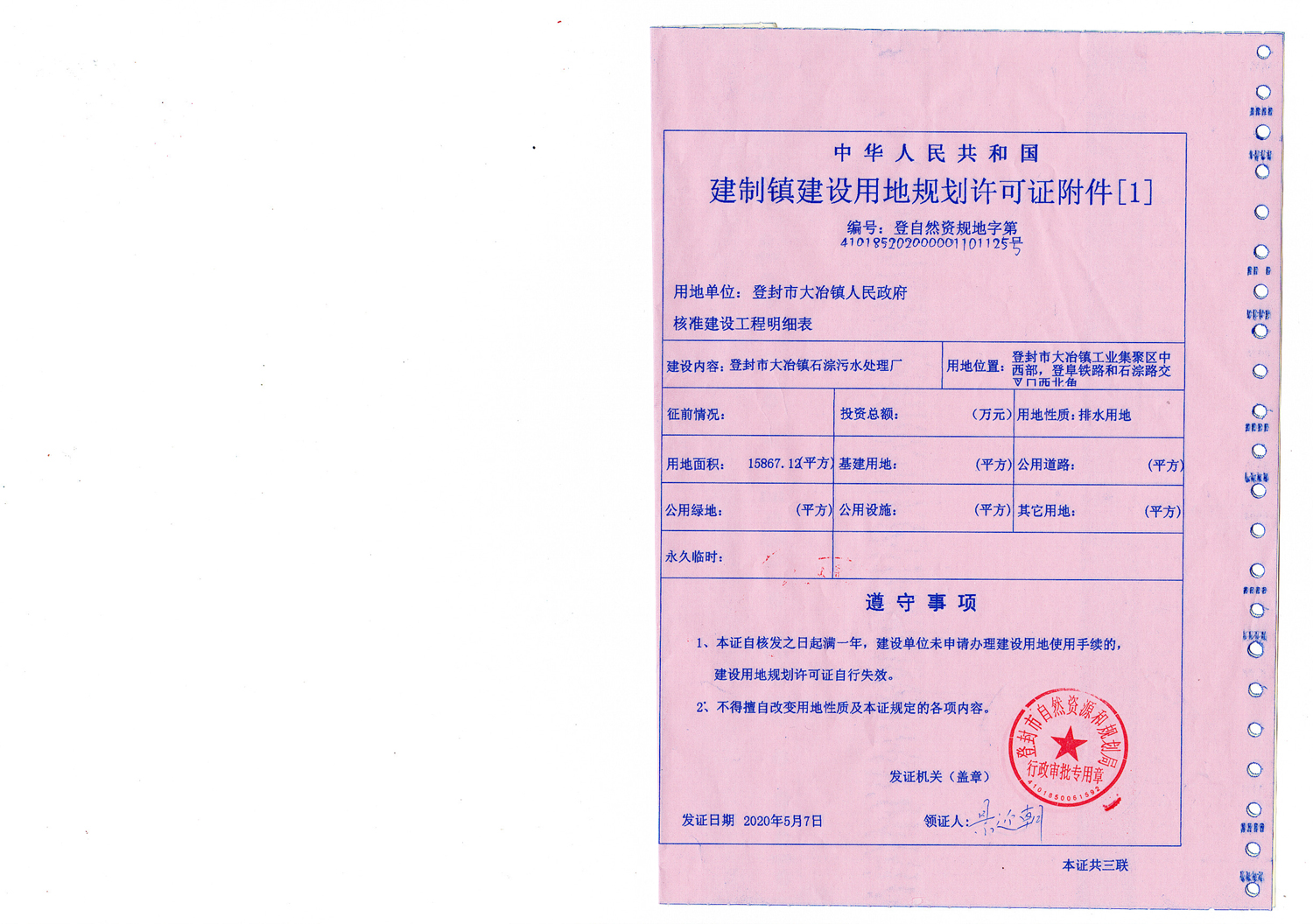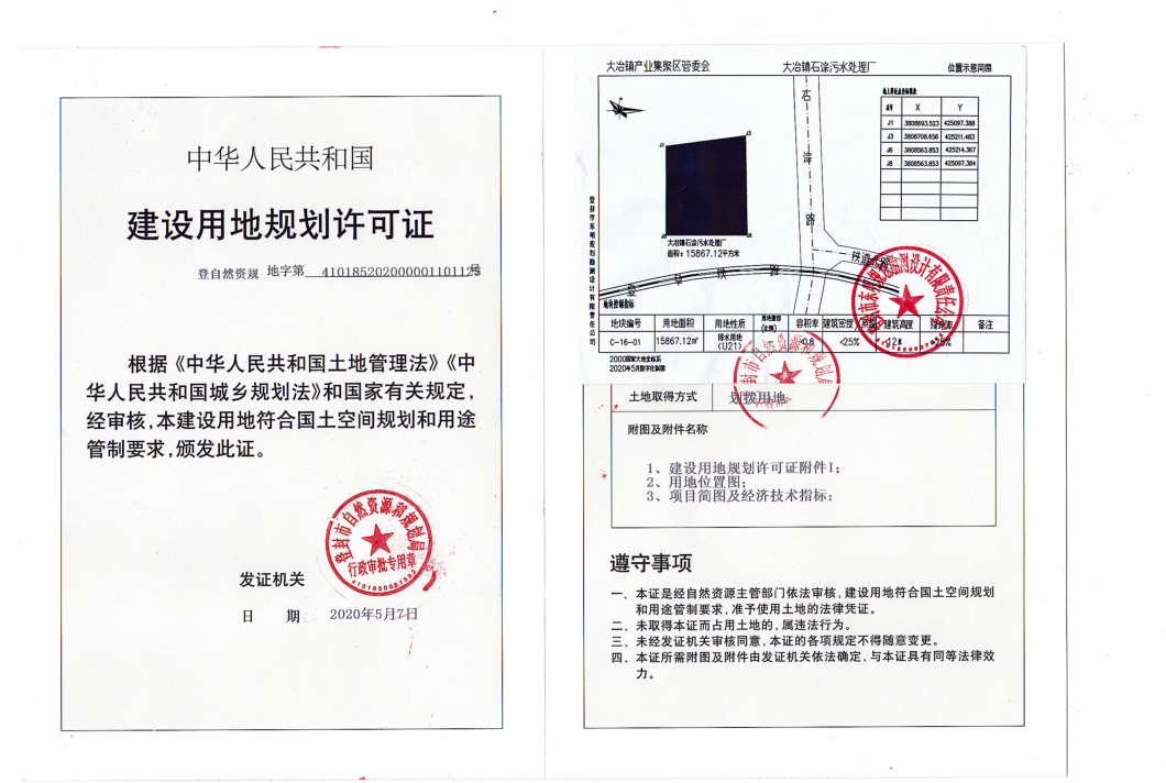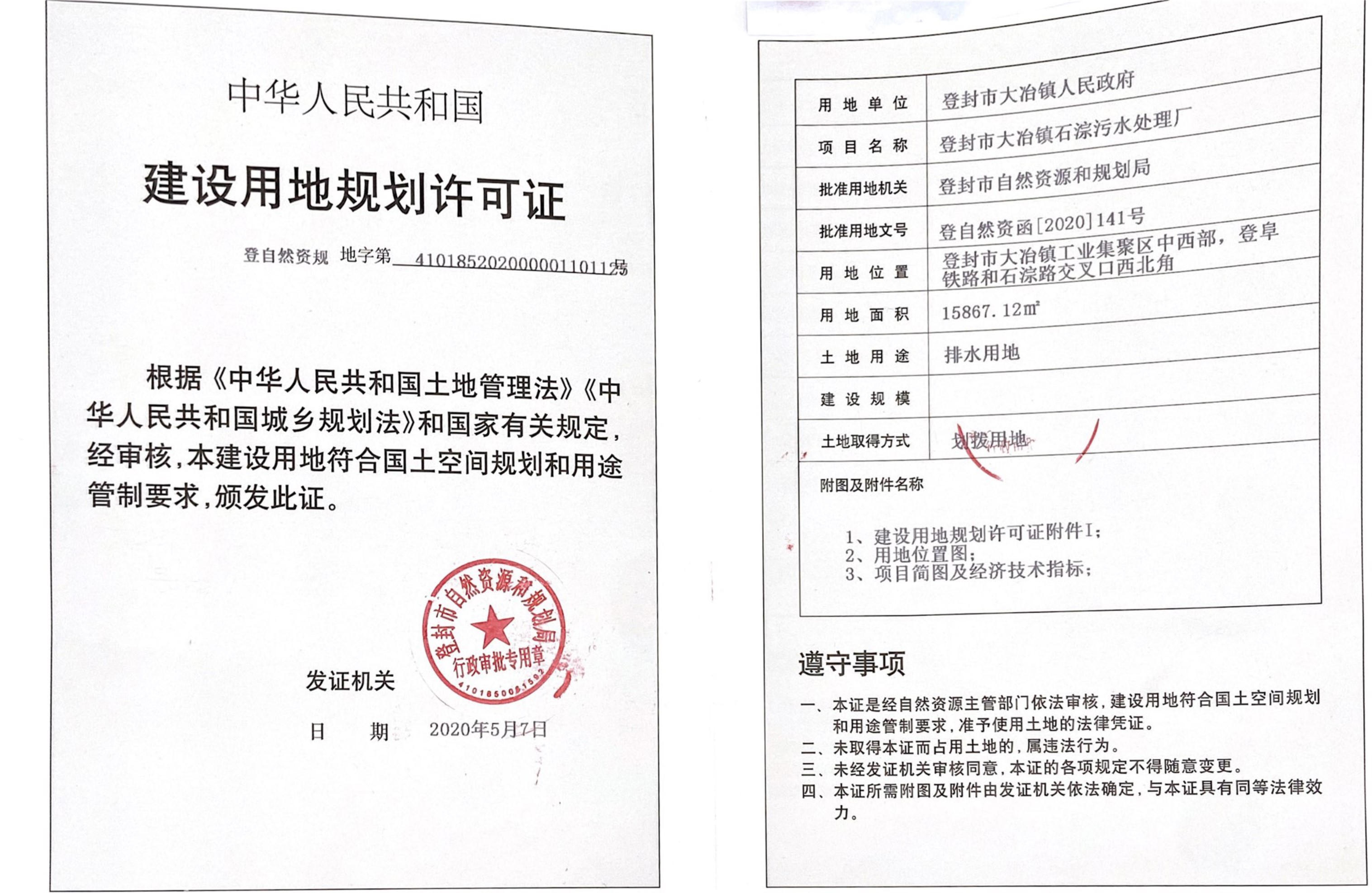登封市大冶镇石淙污水处理厂建设用地规划许可证批后公告