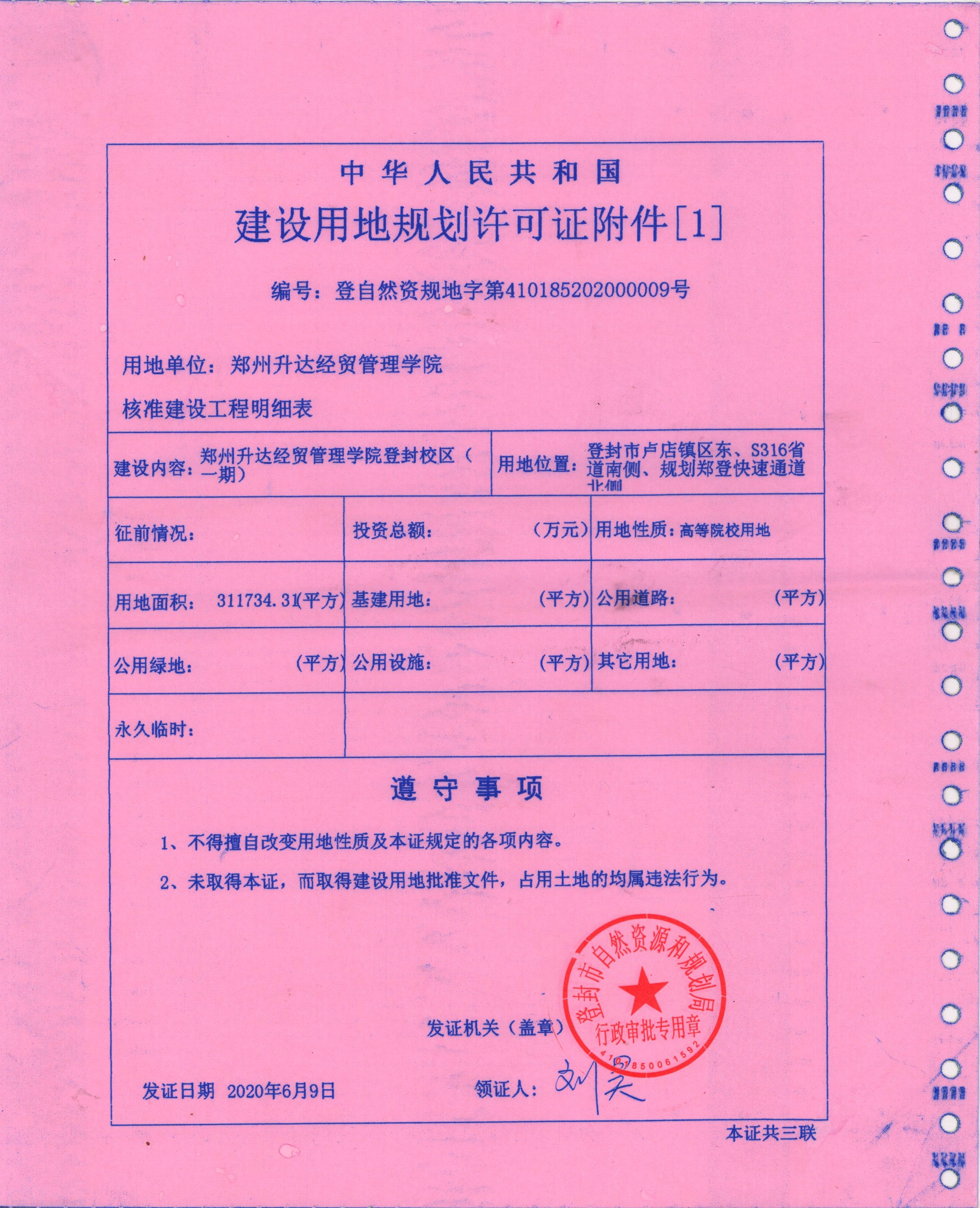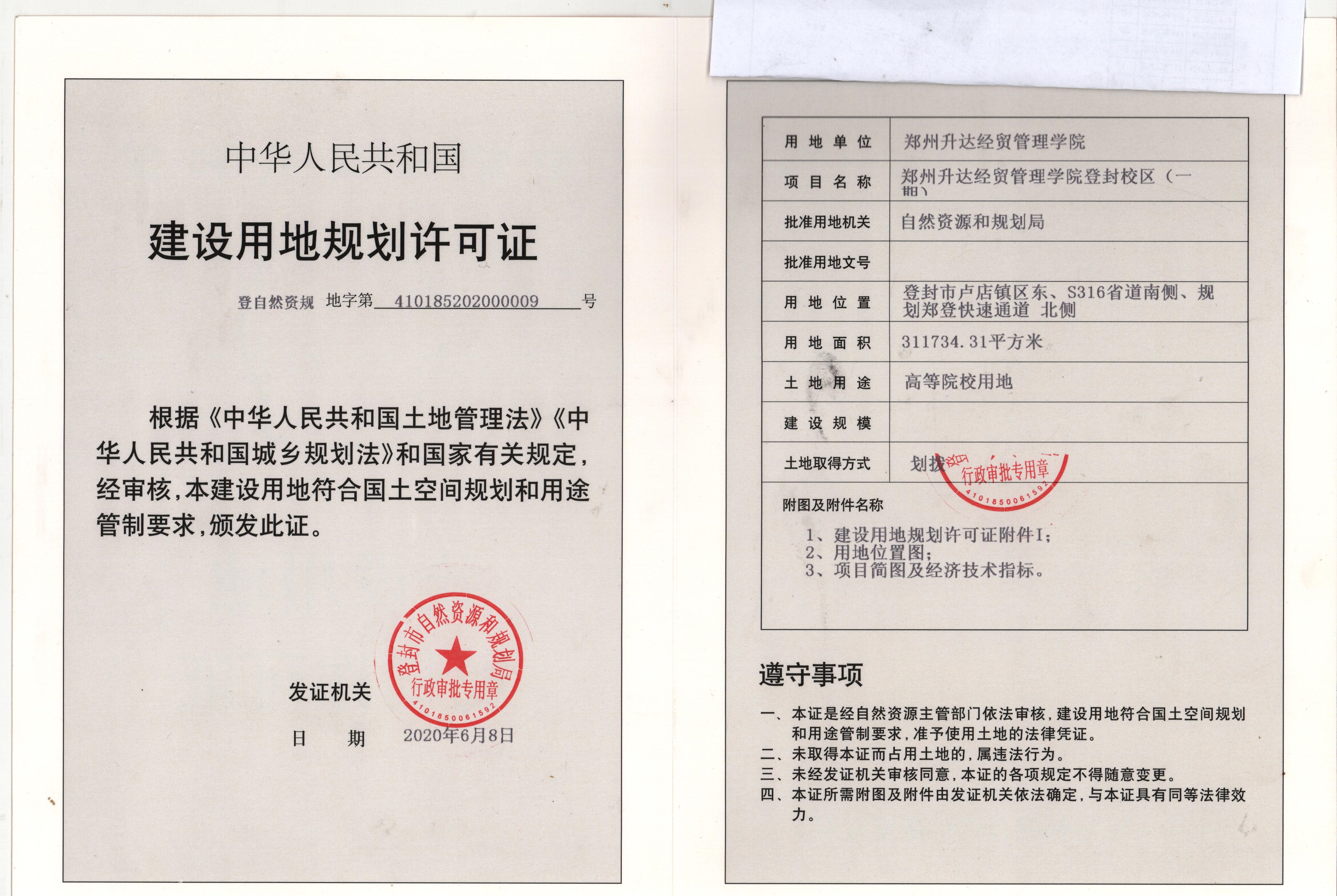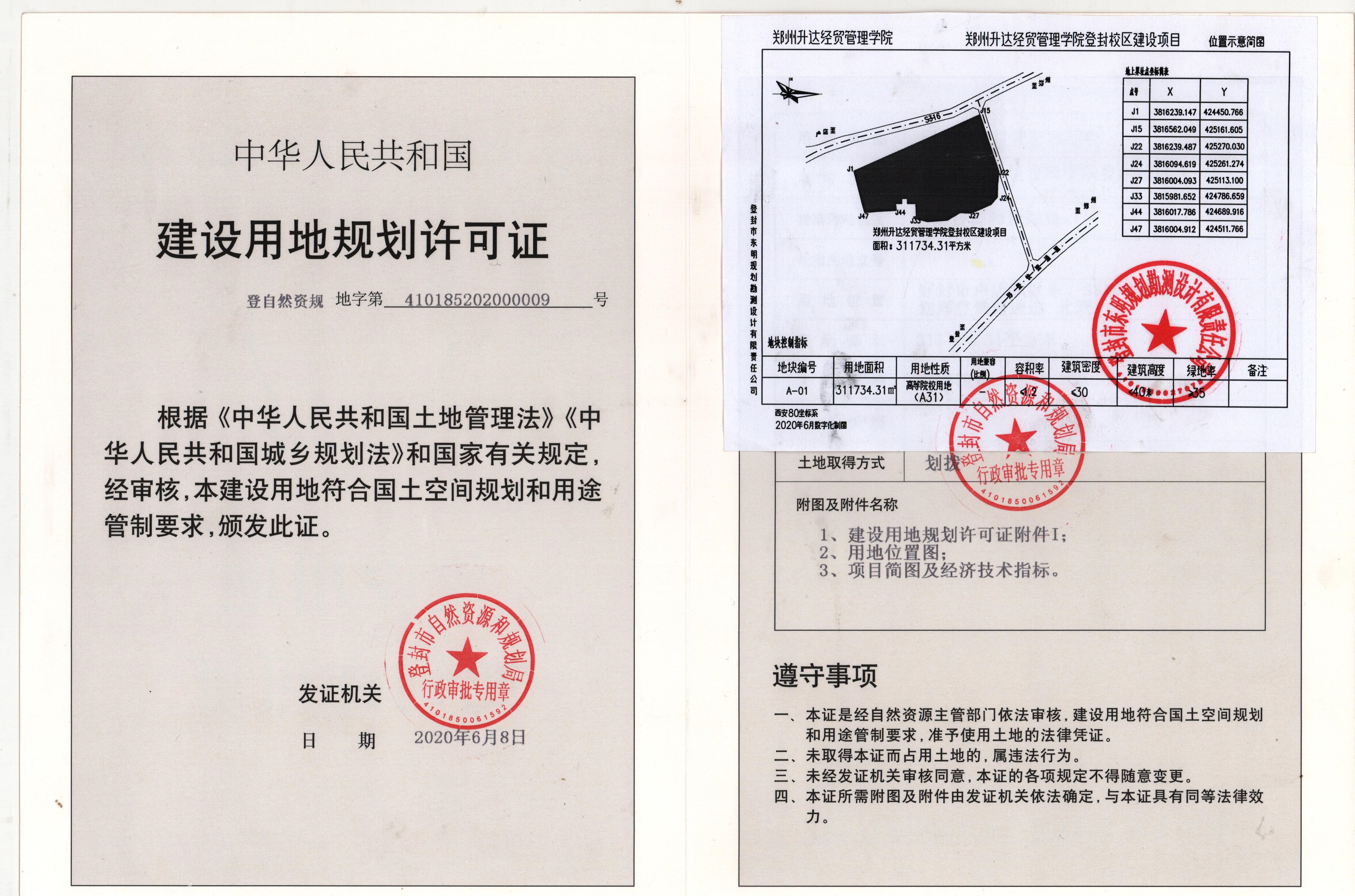 郑州升达经贸管理学院登封校区(一期)建设用地规划许可证批后公告