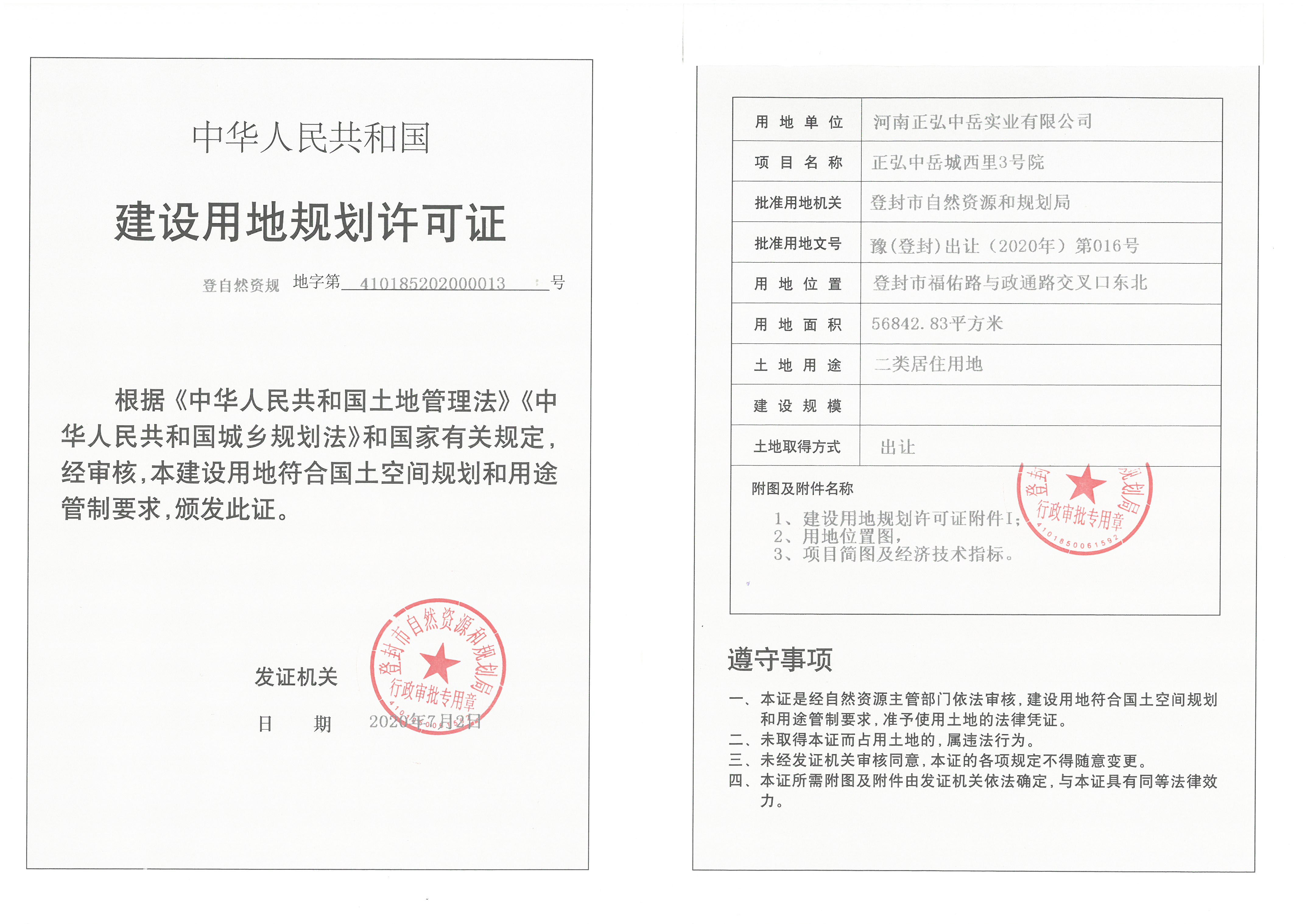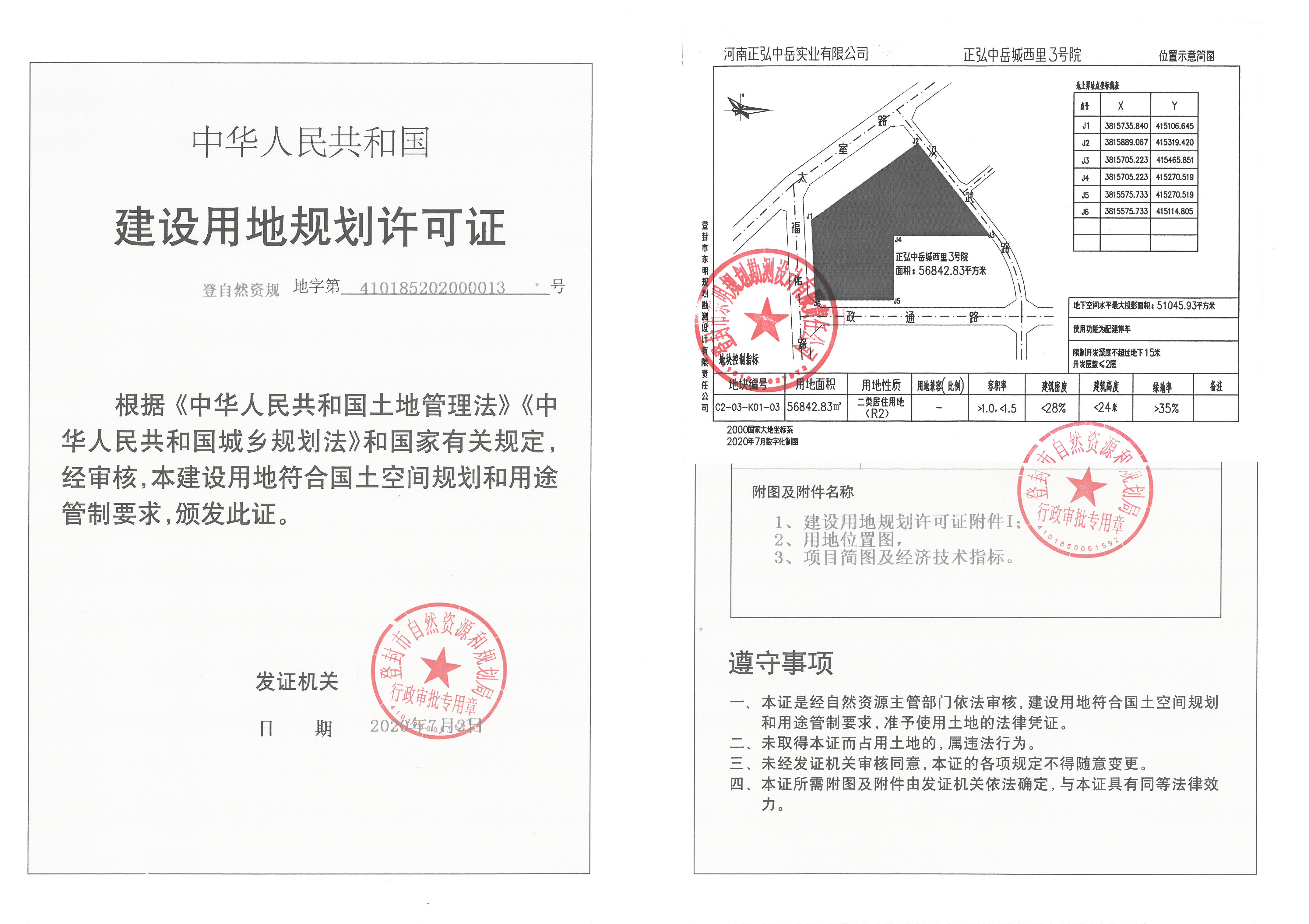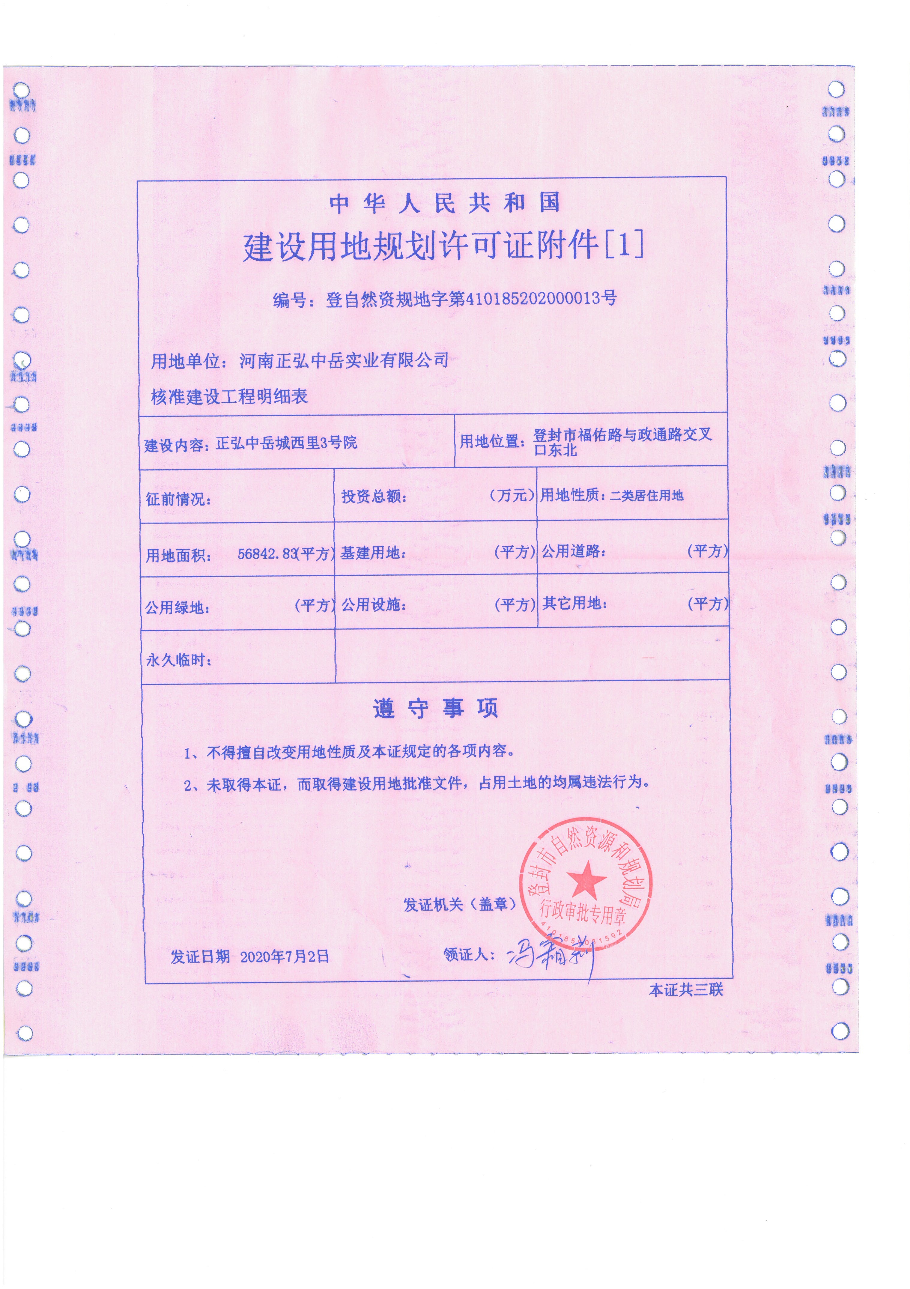登封市自然资源和规划局关于正弘中岳城西里3号院(56842.83㎡)建设用地规划许可证批后公告