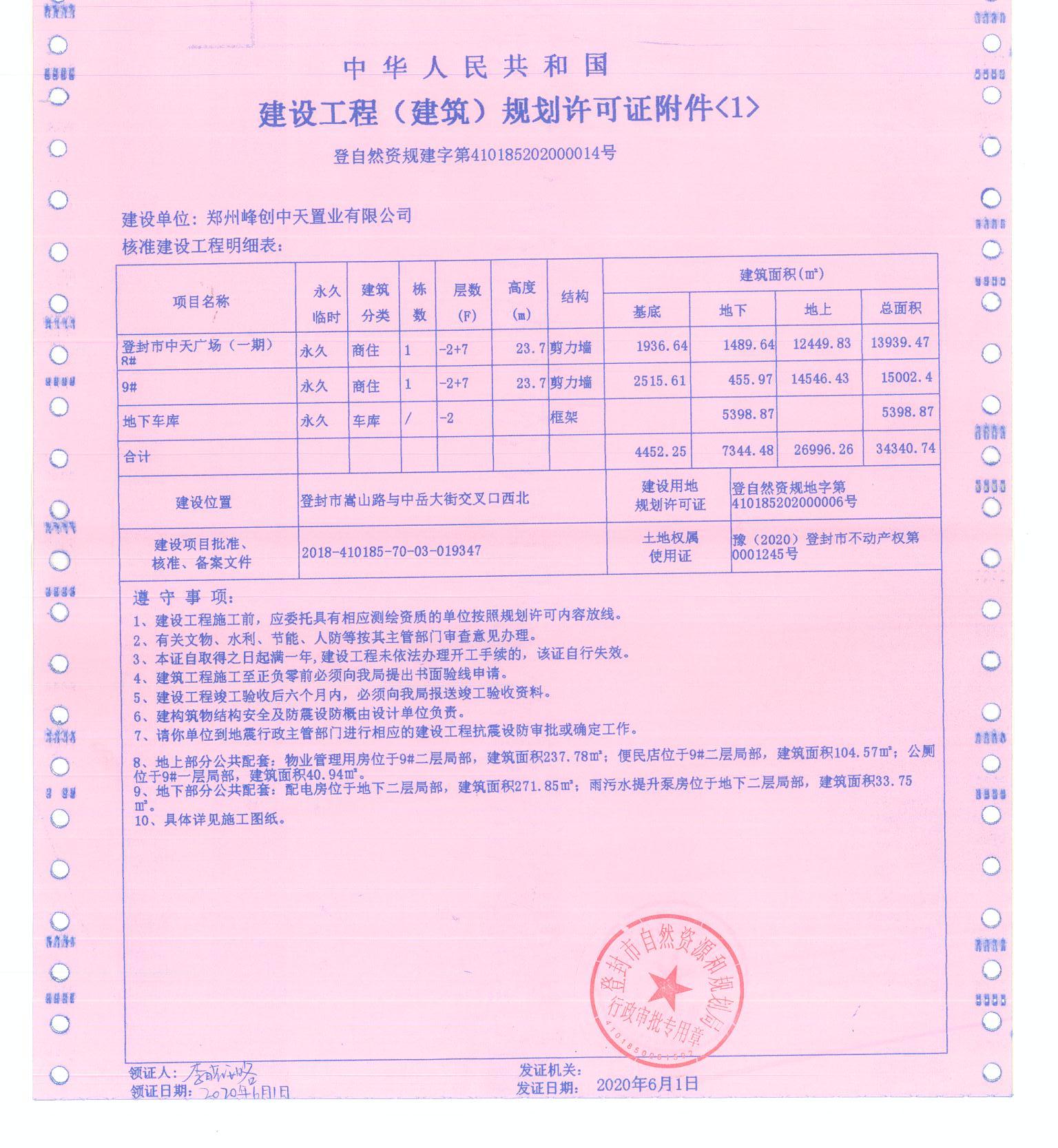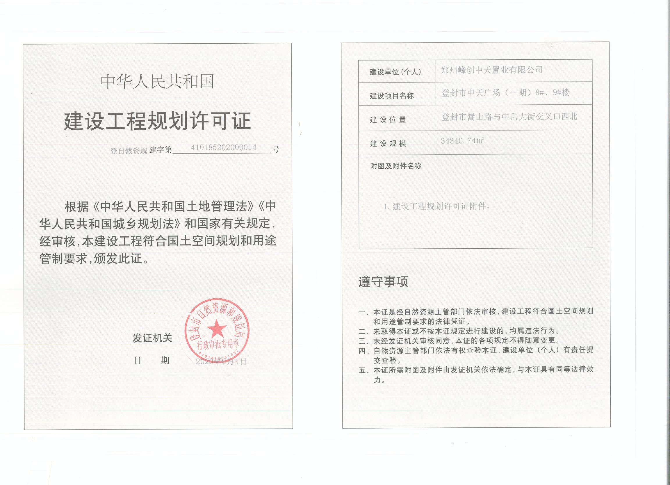 登封市自然资源和规划局关于登封市中天广场8#、9#楼建设工程规划证证后公告