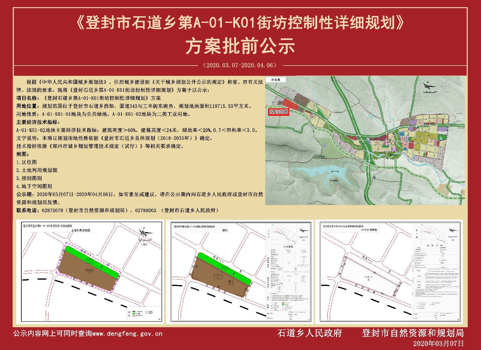 公示内容:登封市石道乡第A-01-K01街坊控制性详细规划方案