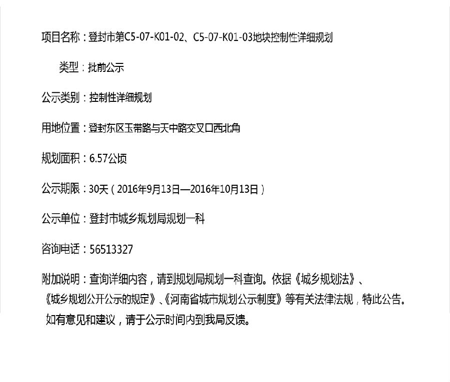 《登封市第C5-07-K01-02、C5-07-K01-03地块控制性详细规划》批前公示