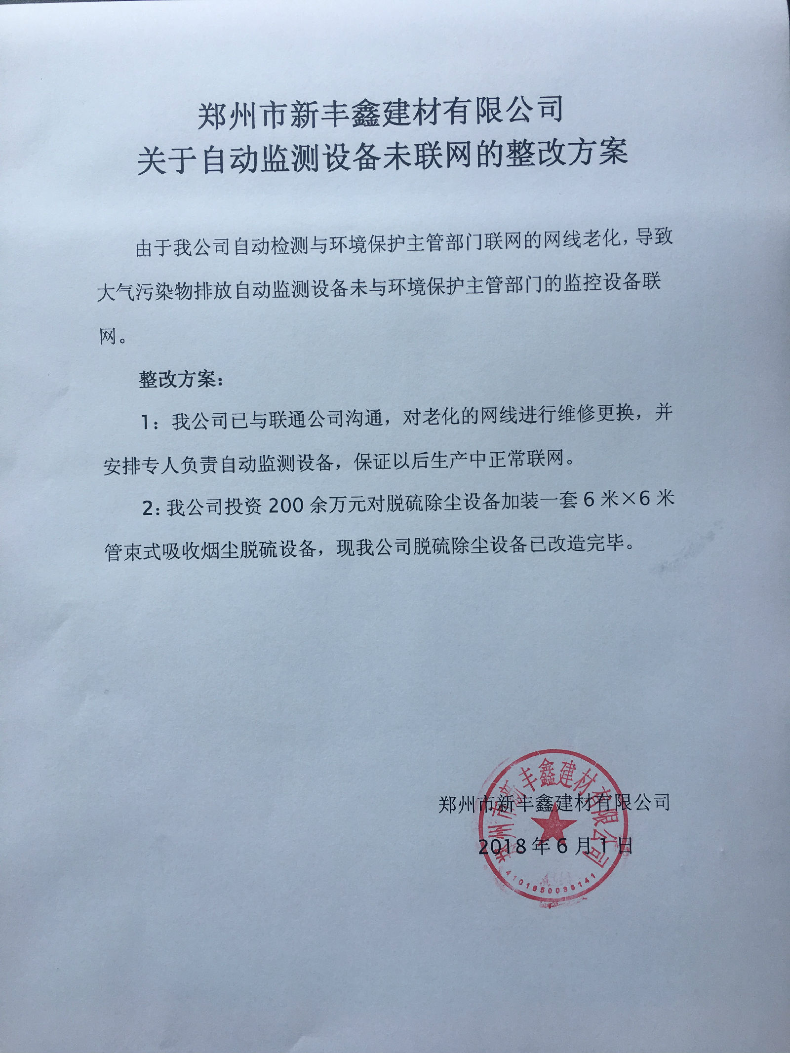 郑州市新丰鑫建材有限公司关于自动监测设备未联网的整改方案