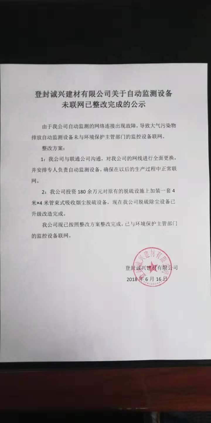 登封诚兴建材有限公司关于自动监测设备未联网已整改完成的公示