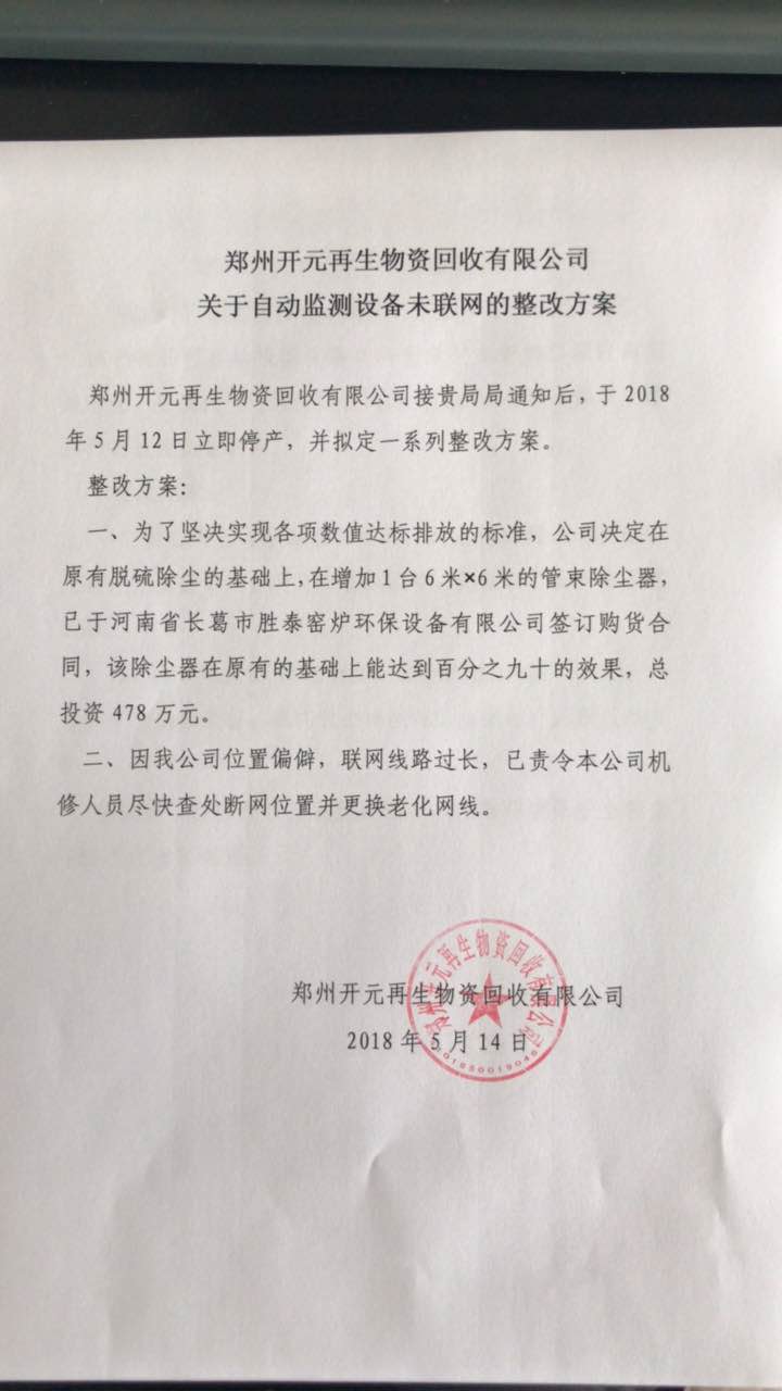 郑州开元再生物资回收有限公司关于自动监测设备未联网的整改方案