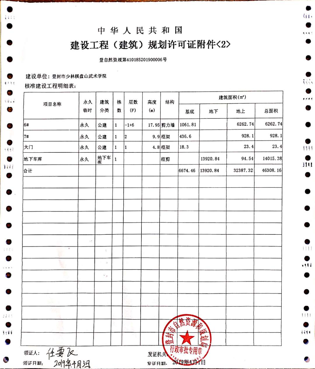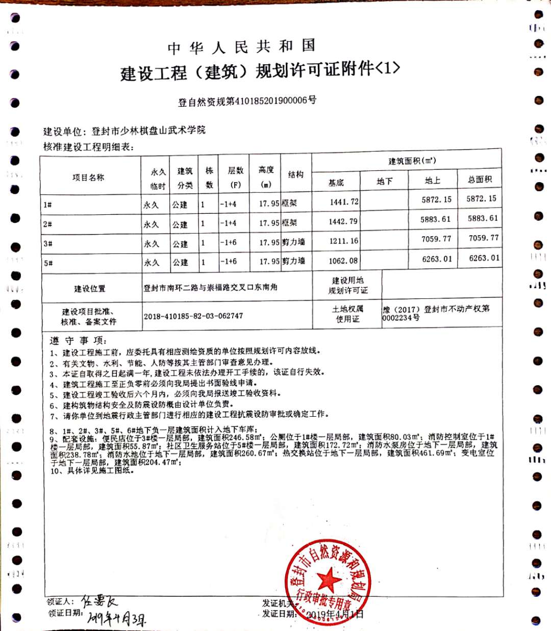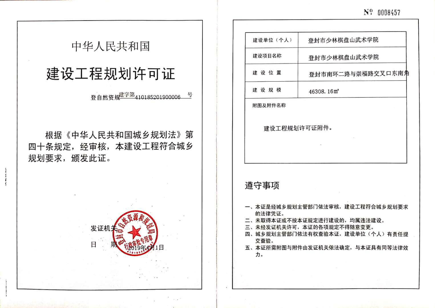 登封市少林棋盘山武术学院建设工程规划许可证批后公告