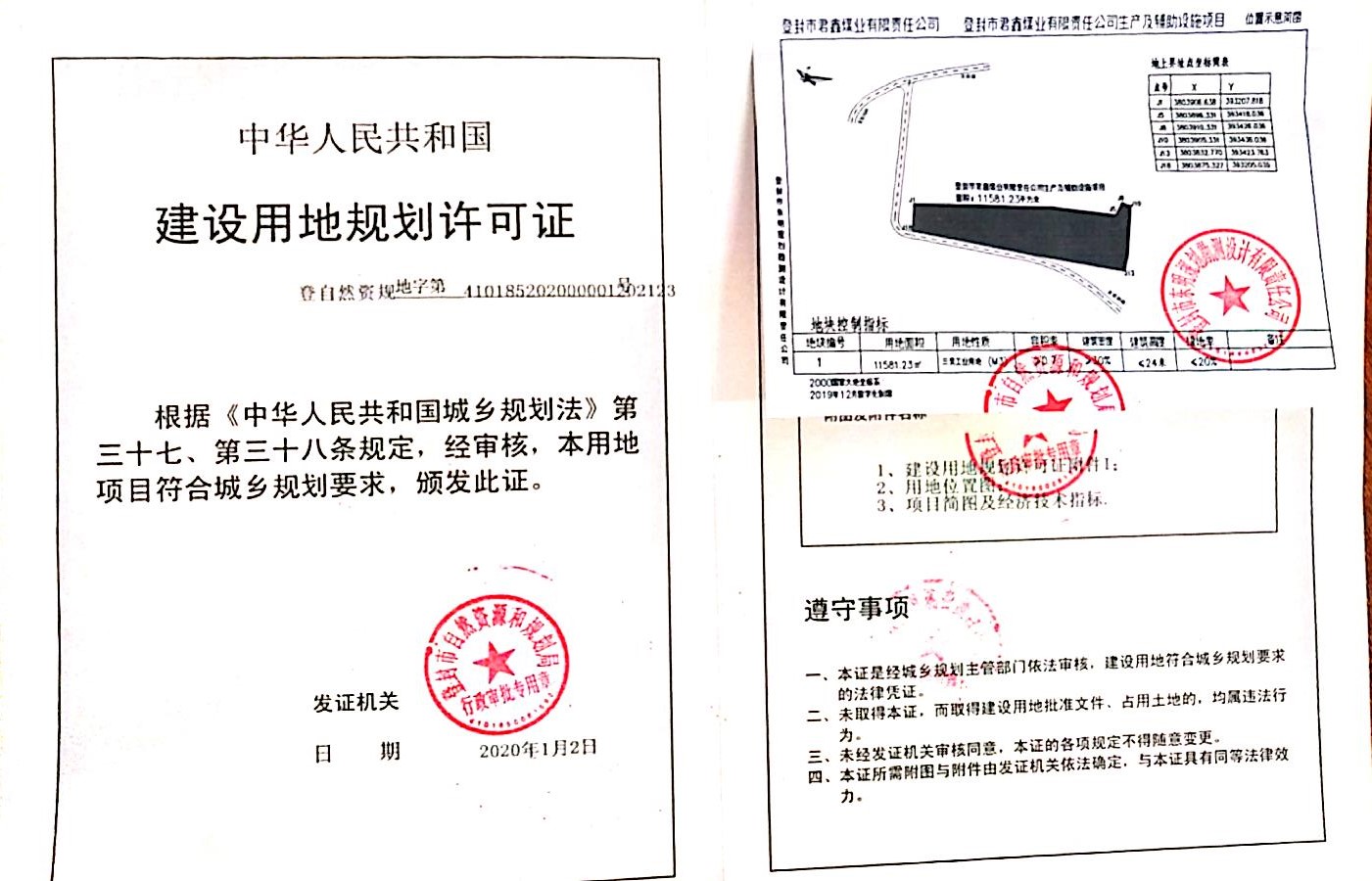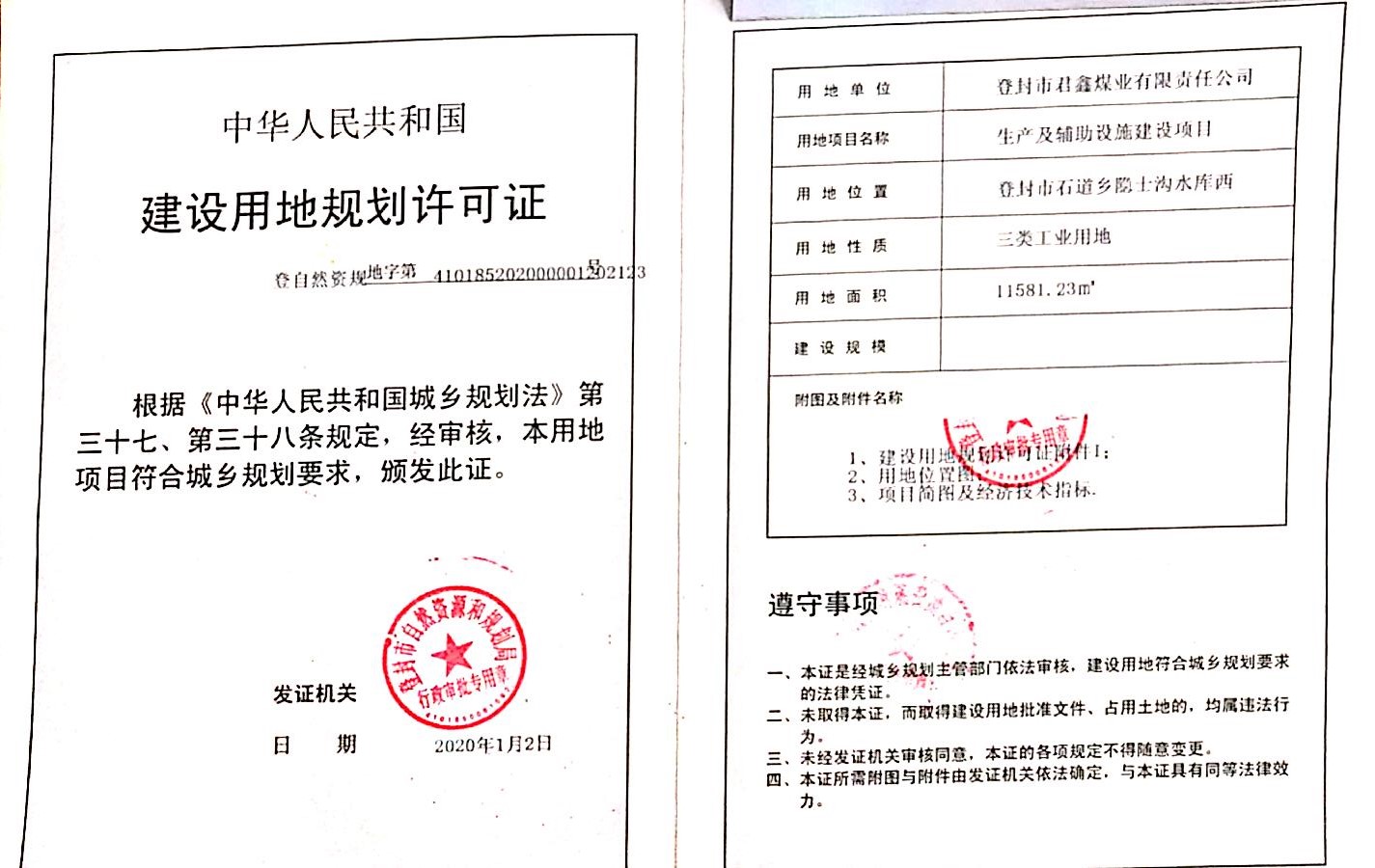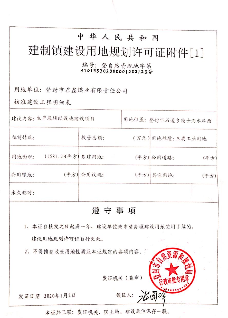 生产及辅助设施建设项目用地规划许可证批后公告