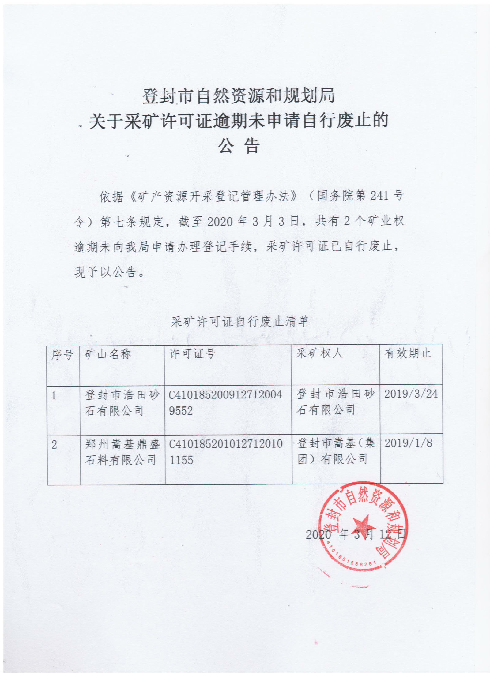登封市自然资源和规划局关于采矿许可证逾期未申请自行废止的公告