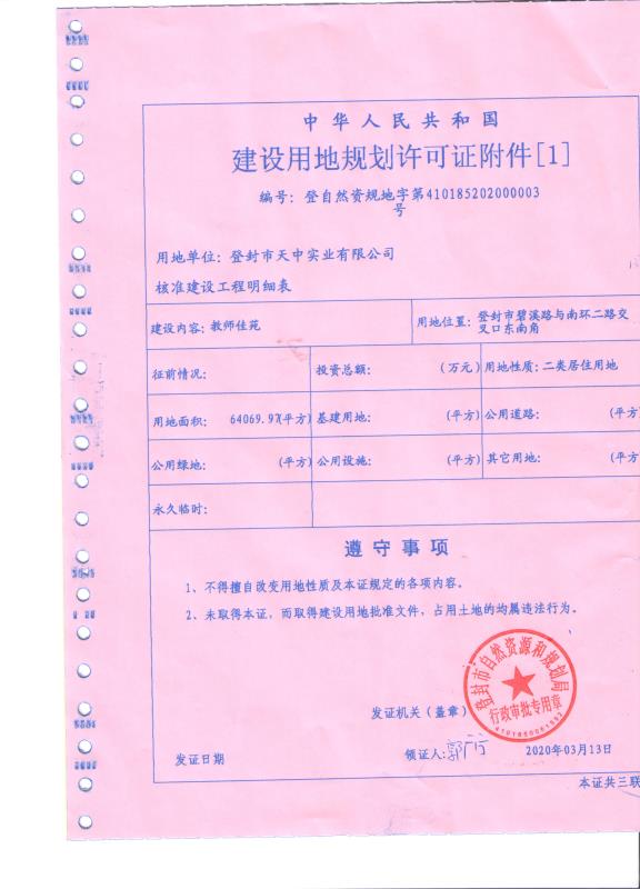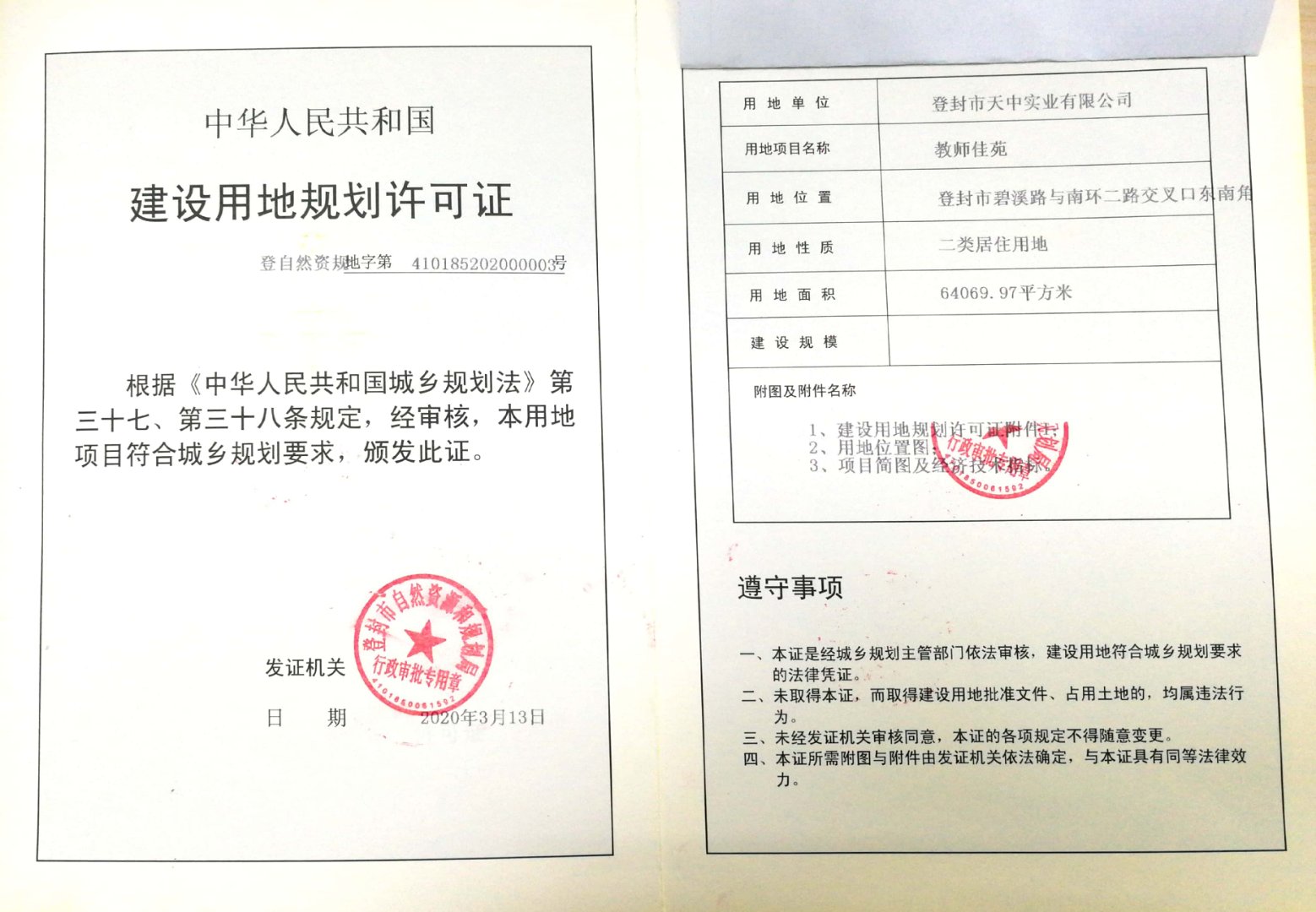 登封市自然资源和规划局教师佳苑建设用地规划许可证批后公告