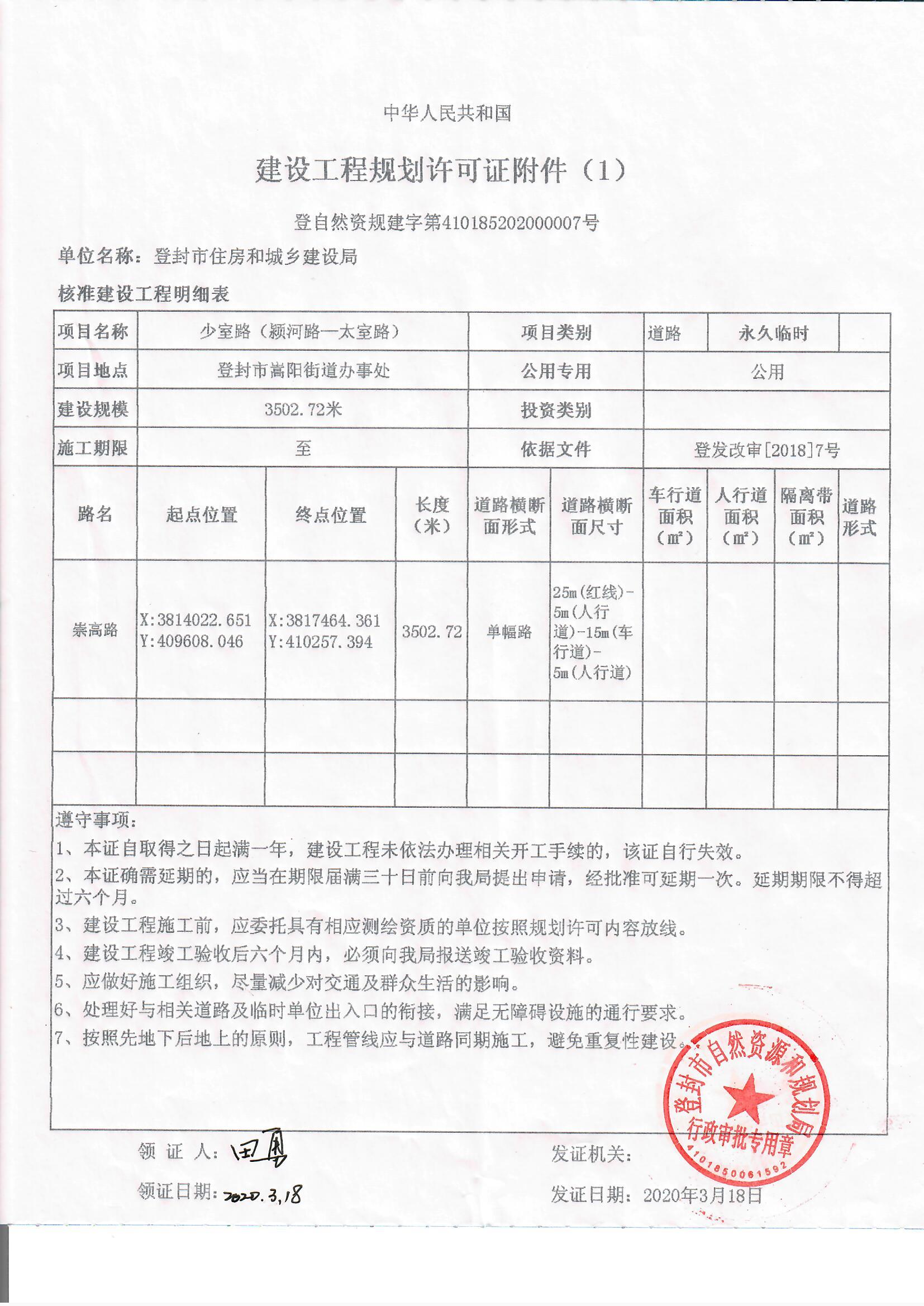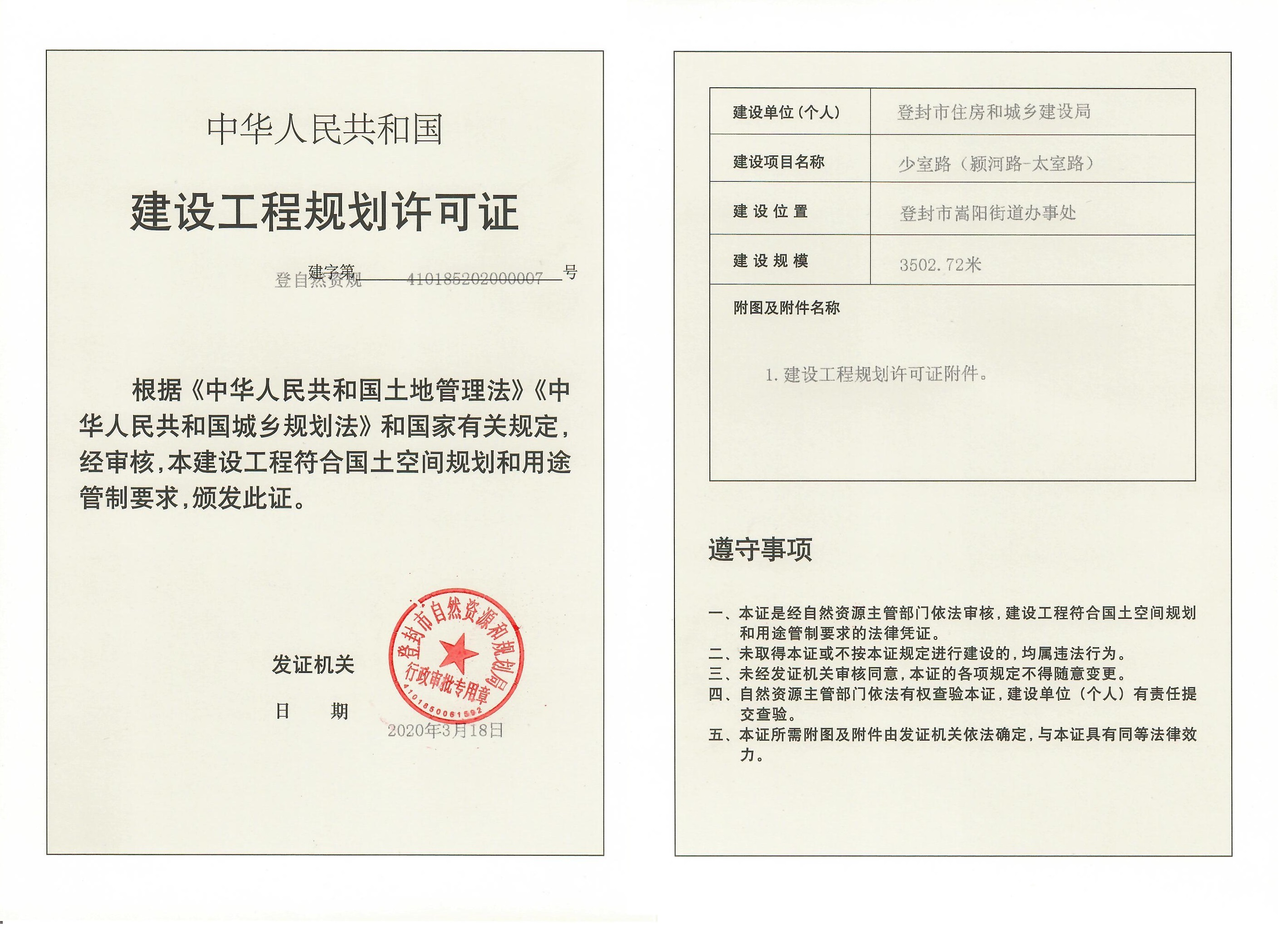 登封市自然资源和规划局关于登封市少室路( 颍河路-太室路)项目建设工程(道路)规划许可证批后公告