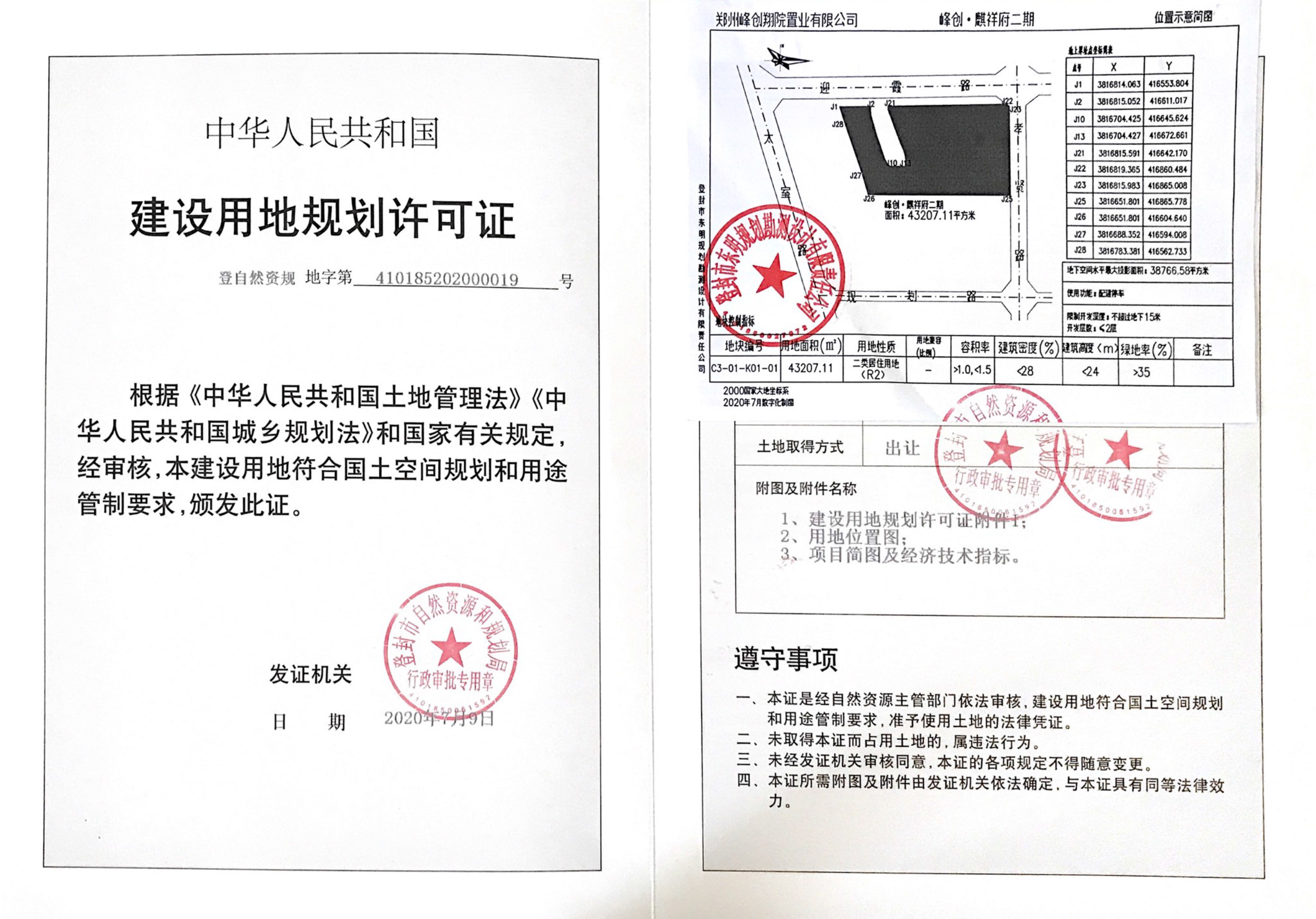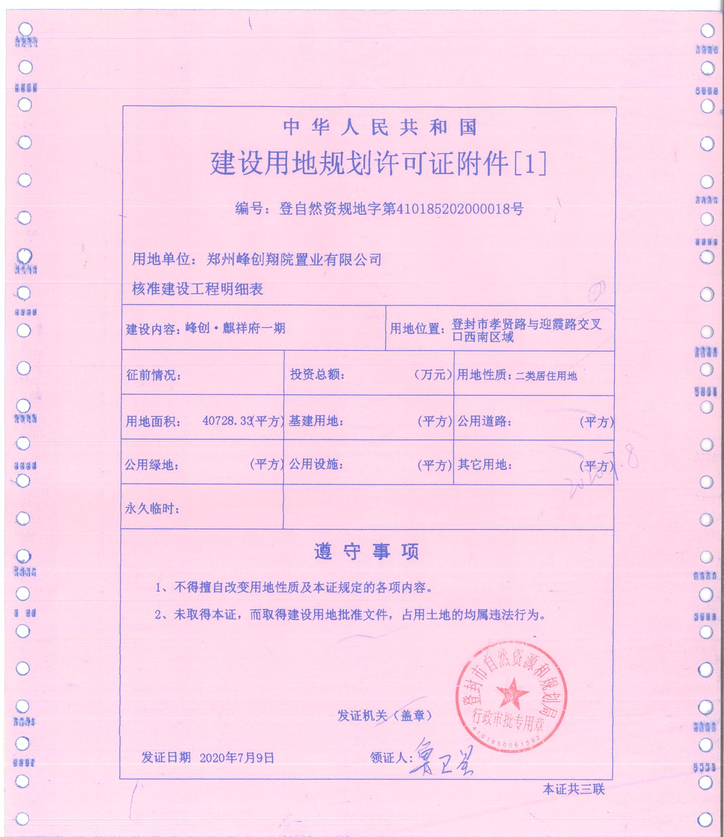 登封市自然资源和规划局关于峰创•麒祥府一期建设用地规划许可证批后公告