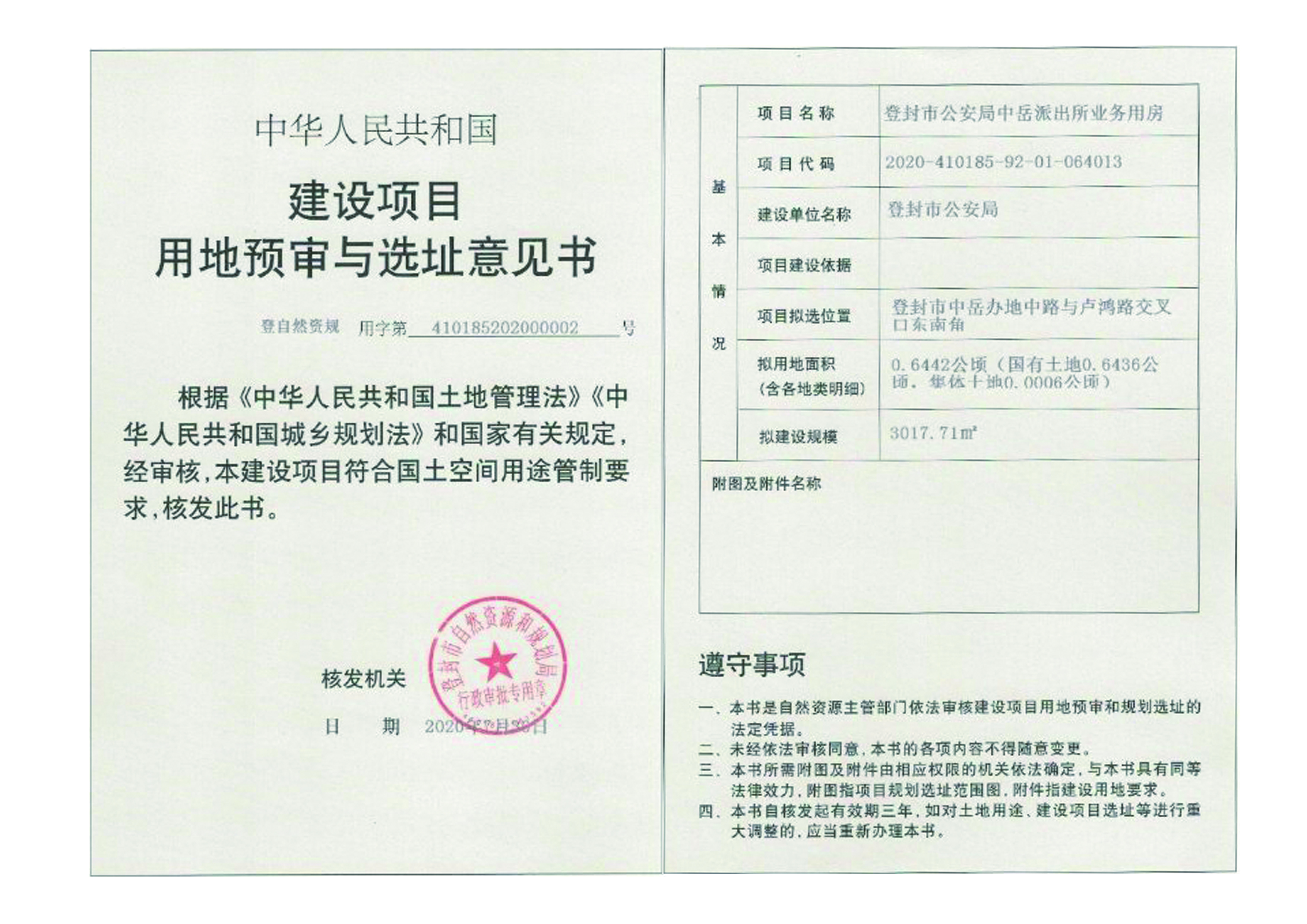 登封市公安局中岳派出所业务用房建设项目用地预审与选址意见书批后公告