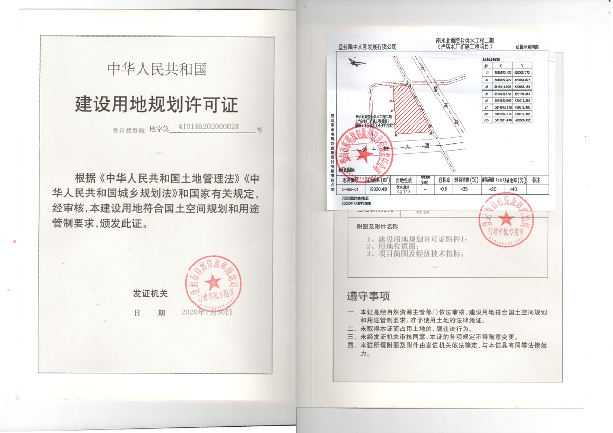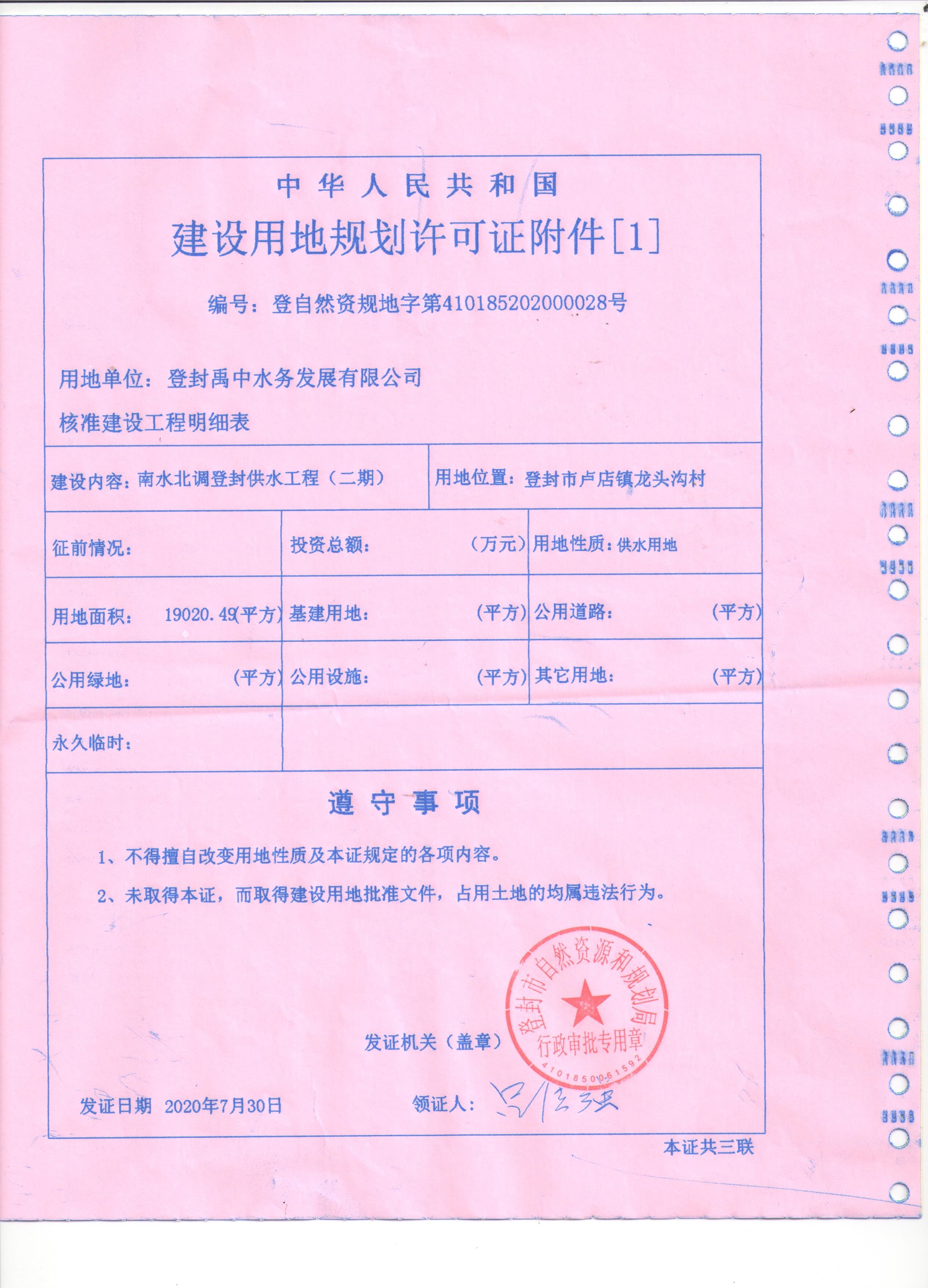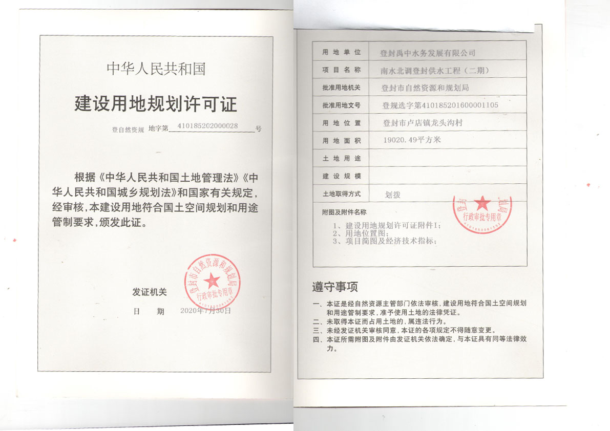 登封市自然资源和规划局关于南水北调登封供水工程(二期)建设用地规划许可证批后公告