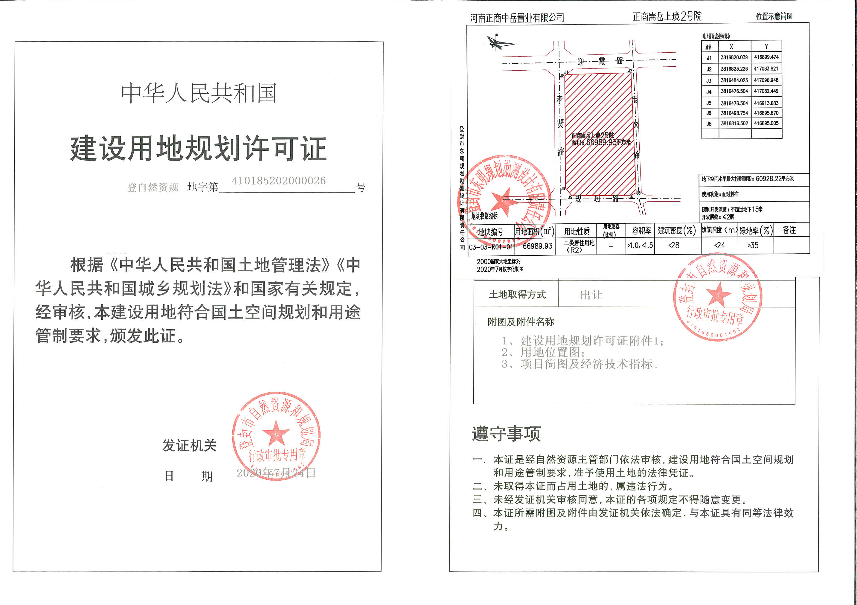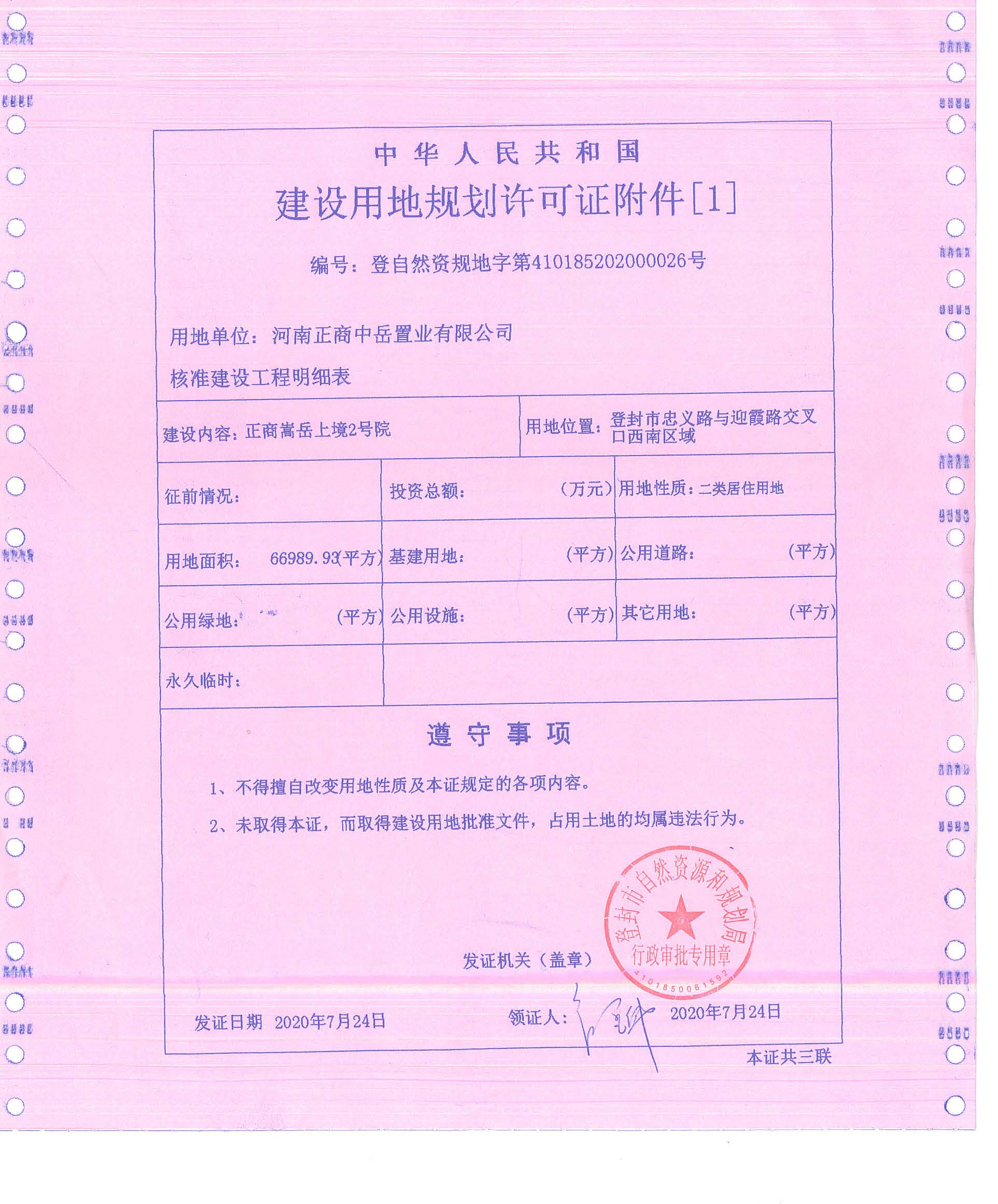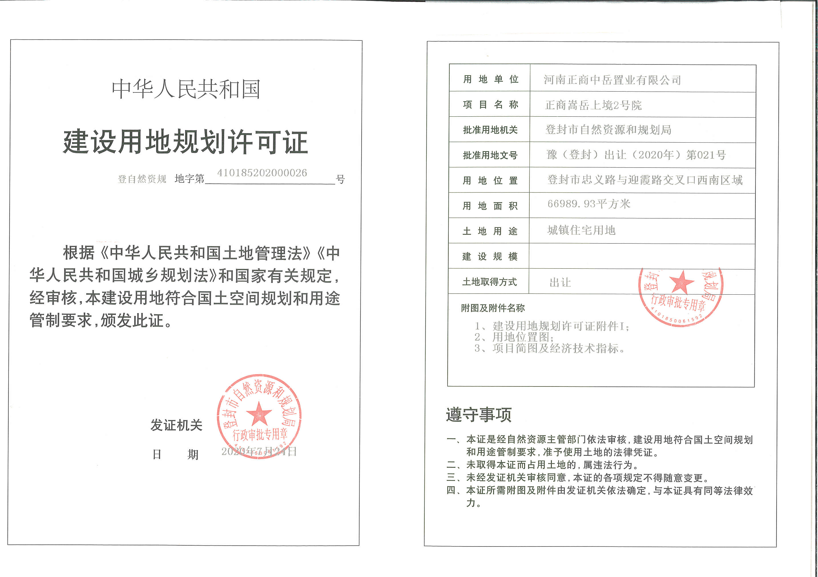 登封市自然资源和规划局关于正商嵩岳上境2号院建设用地规划许可证批后公告