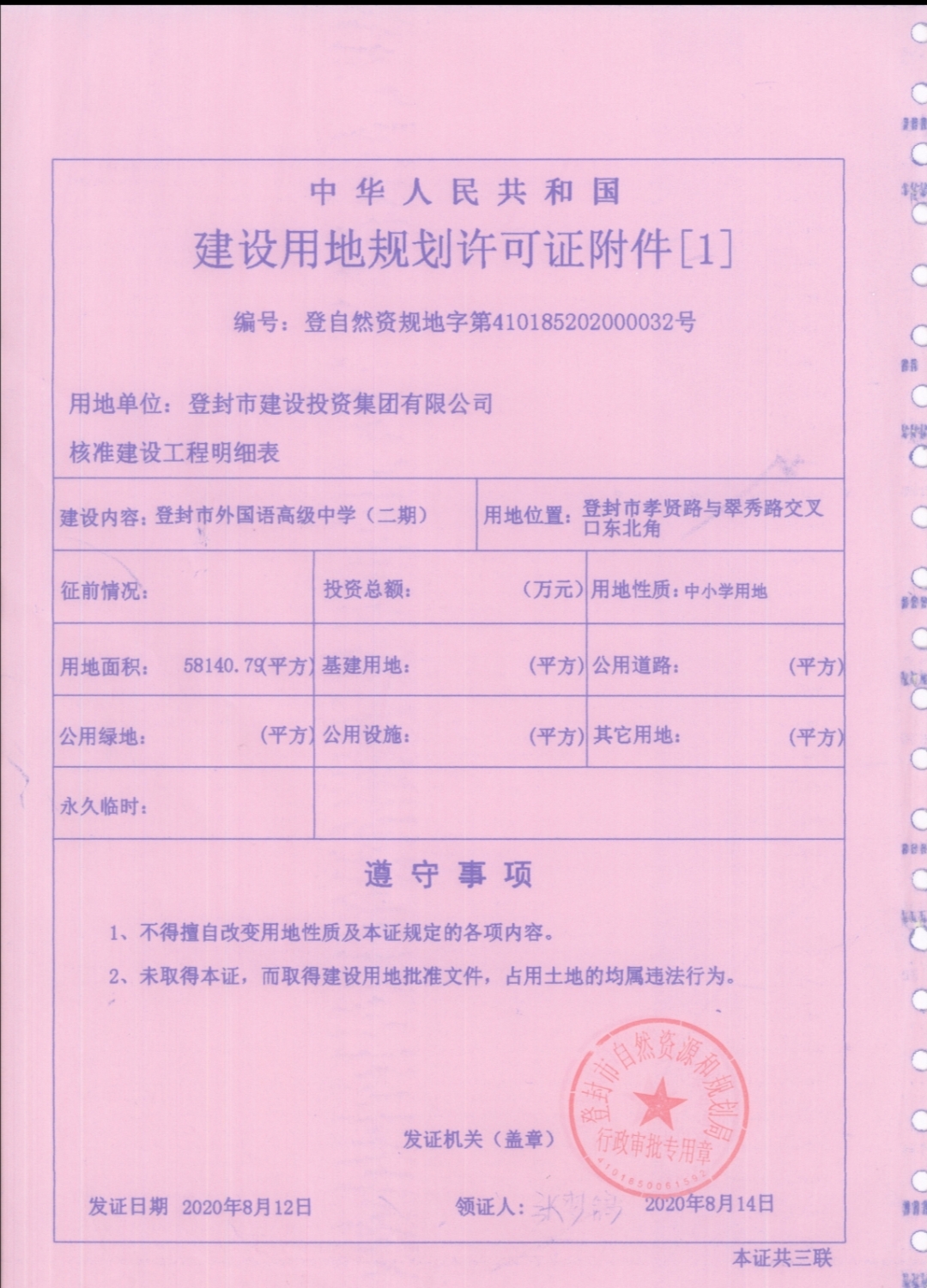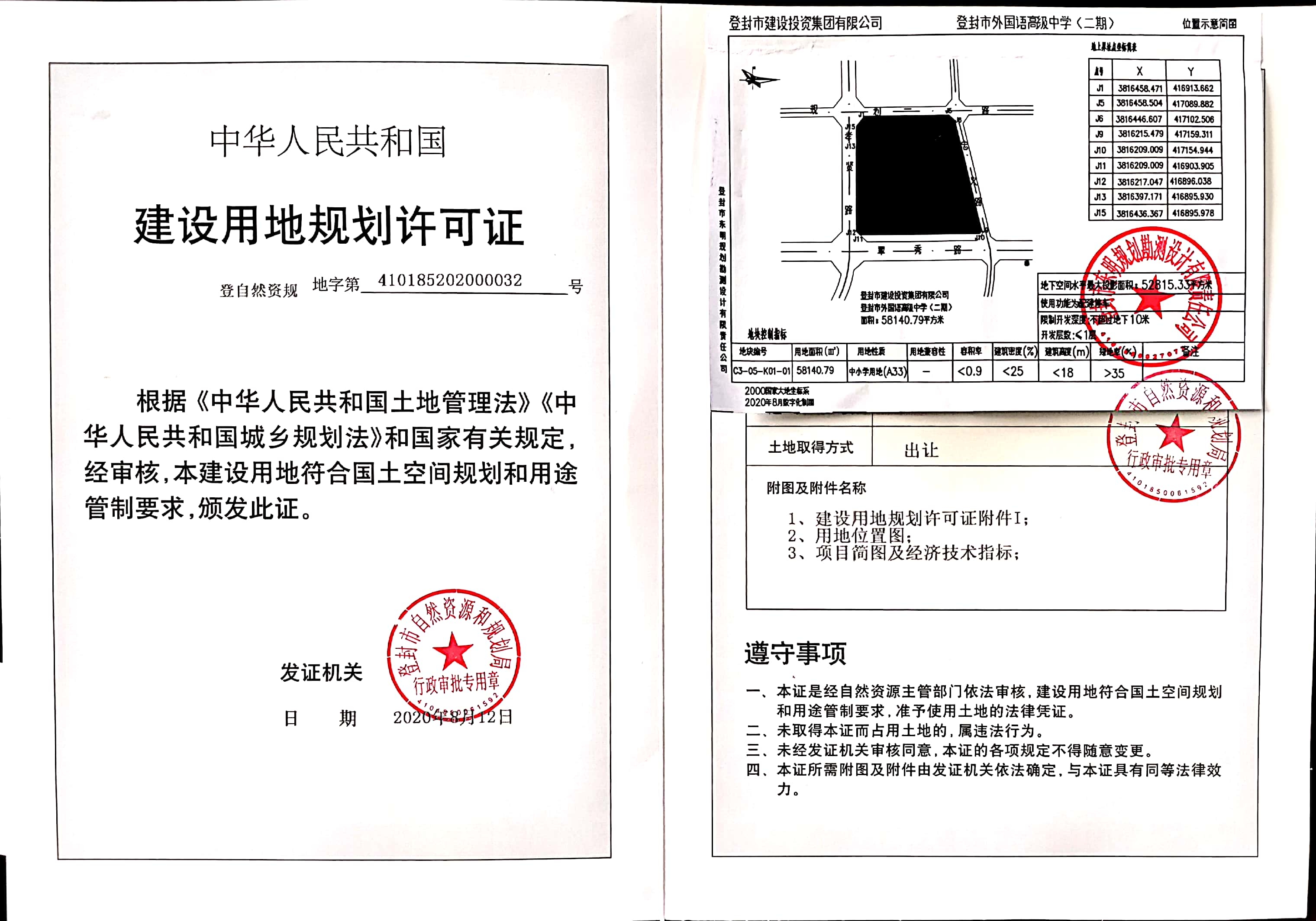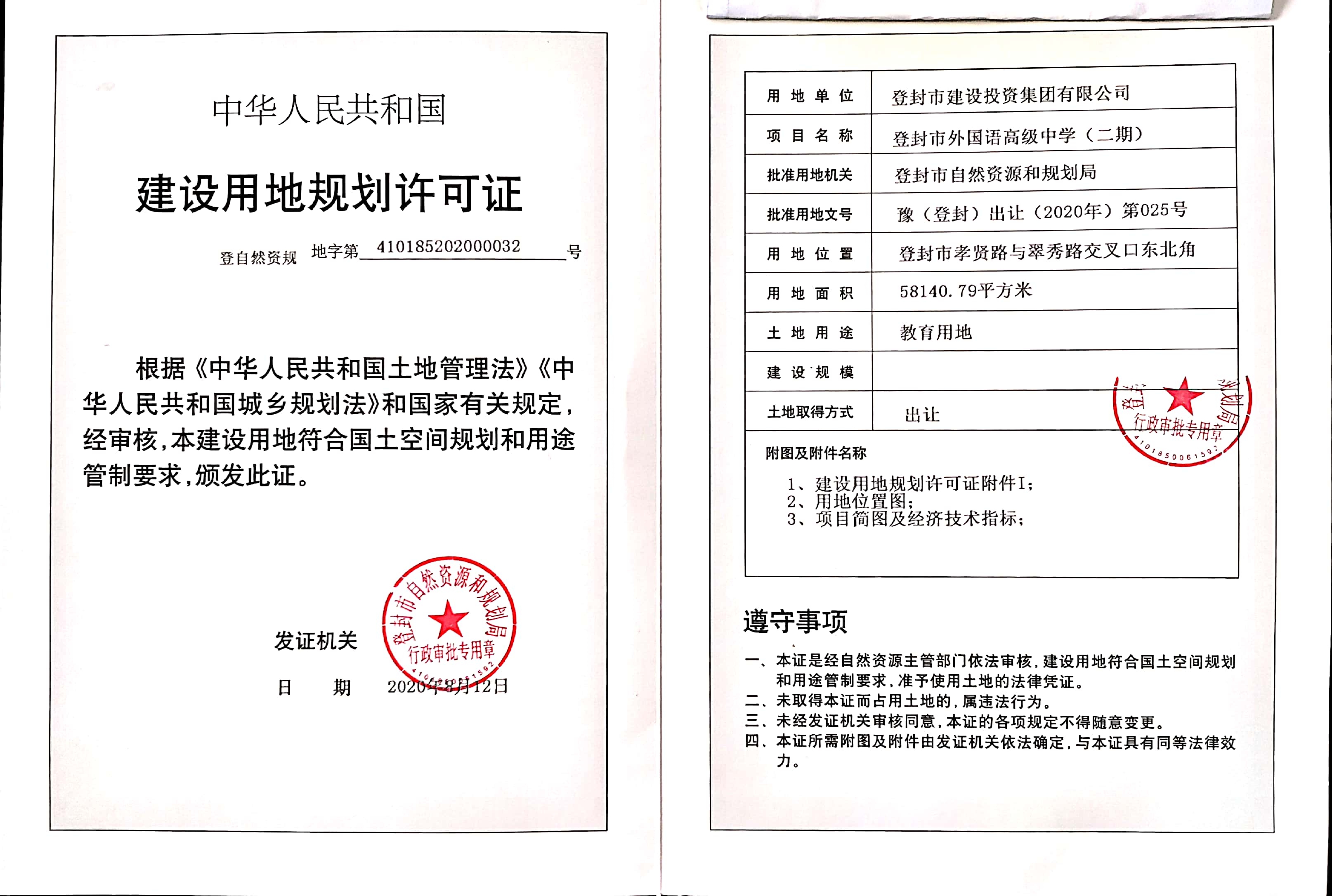 登封市自然资源和规划局关于登封市外国语高级中学(二期)建设用地规划许可证批后公告