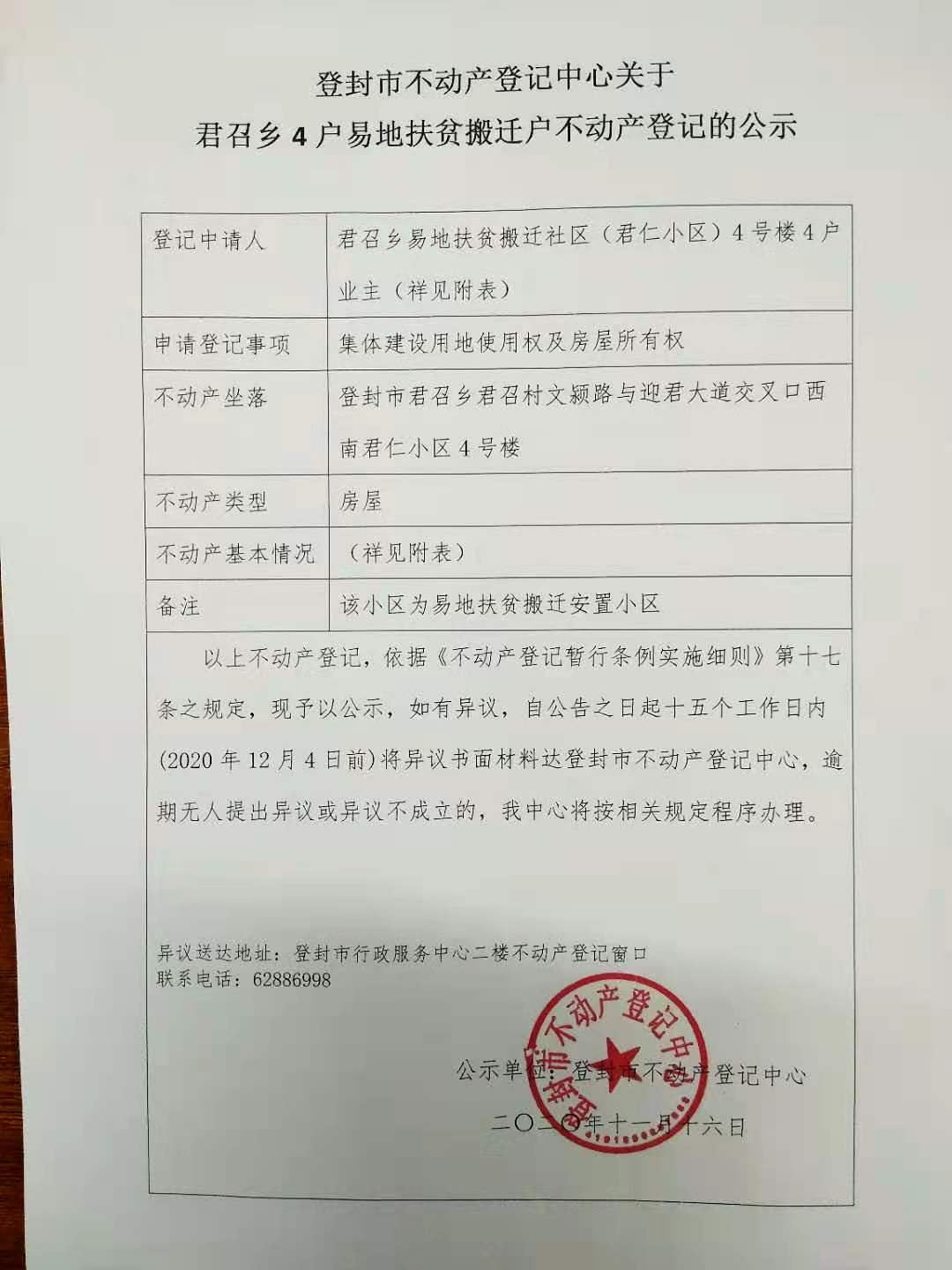 登封市不动产登记中心关于君召乡4户易地扶贫搬迁户不动产登记的公示